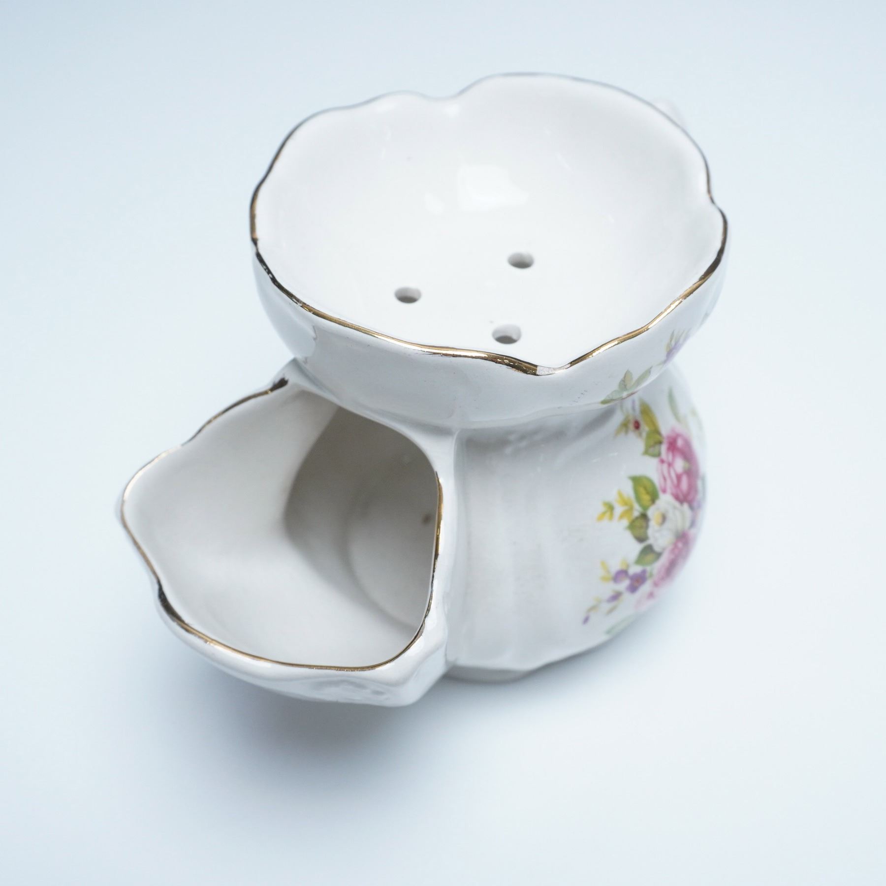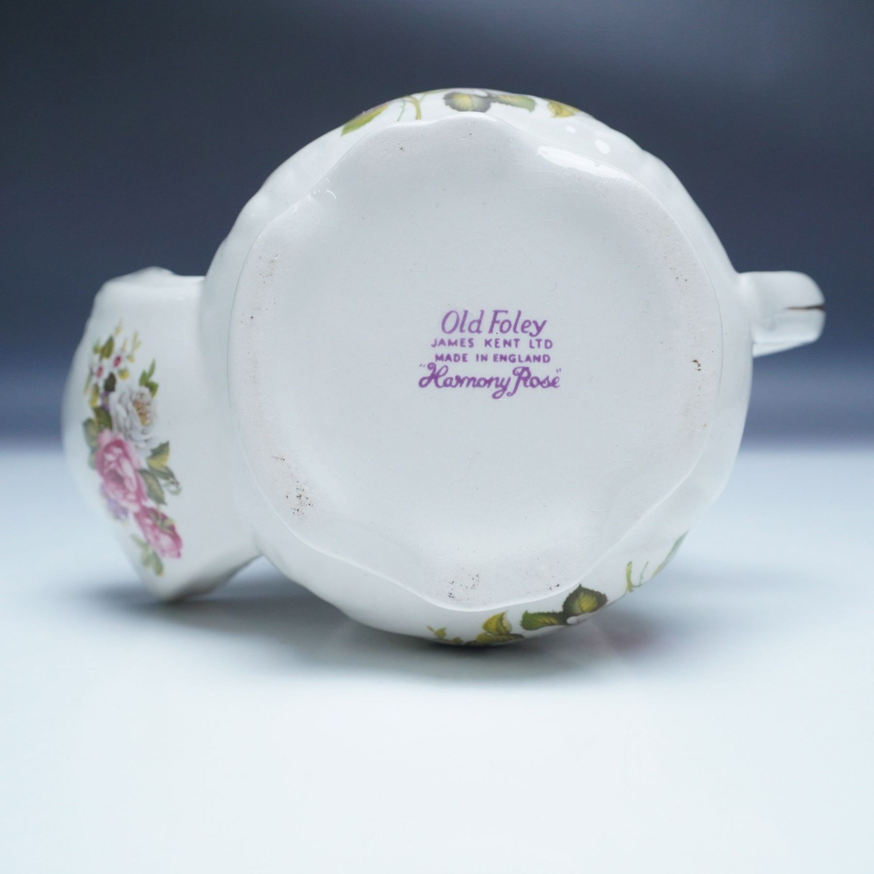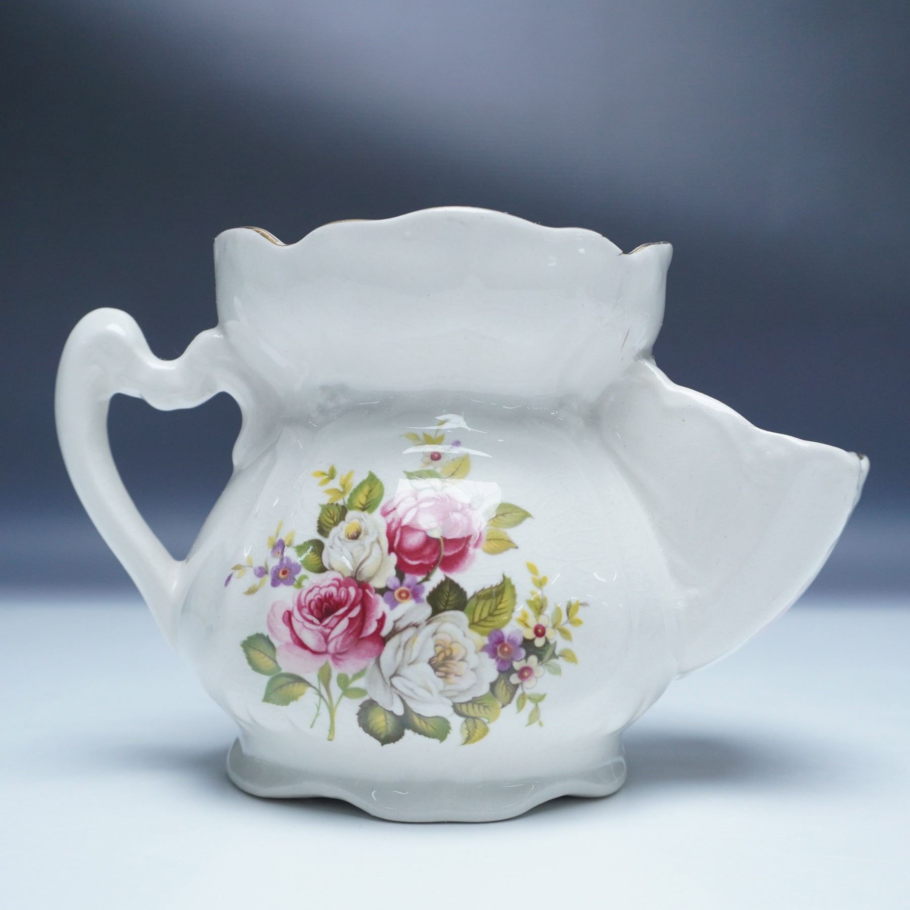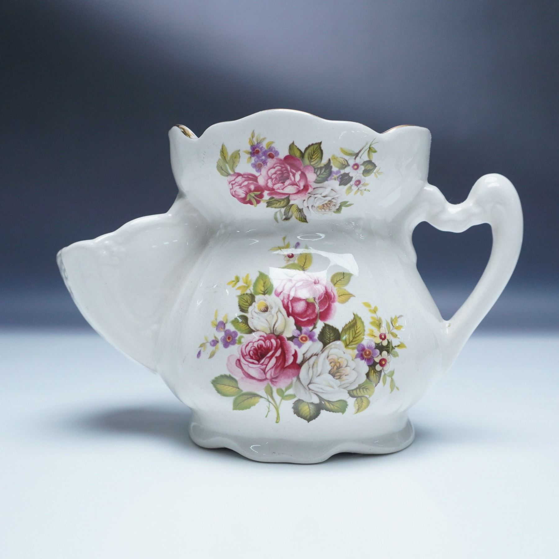 A vintage ceramic shaving scuttle in the Harmony Rose pattern by James Kent Ltd. Designed for traditional wet shaving, it features a compartment for hot water and drainage holes to keep shaving soap warm. Decorated with pink and white roses, gold trim, and scalloped edges, this piece bears the Old Foley backstamp, combining function with classic elegance.
