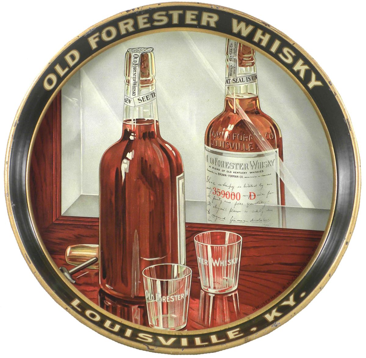 Old Forester Whiskey Tin Serving Tray, Louisville, KY. Very unusual mirror reflection image. Minor edge chips otherwise excellent condition. 12 inch diameter.