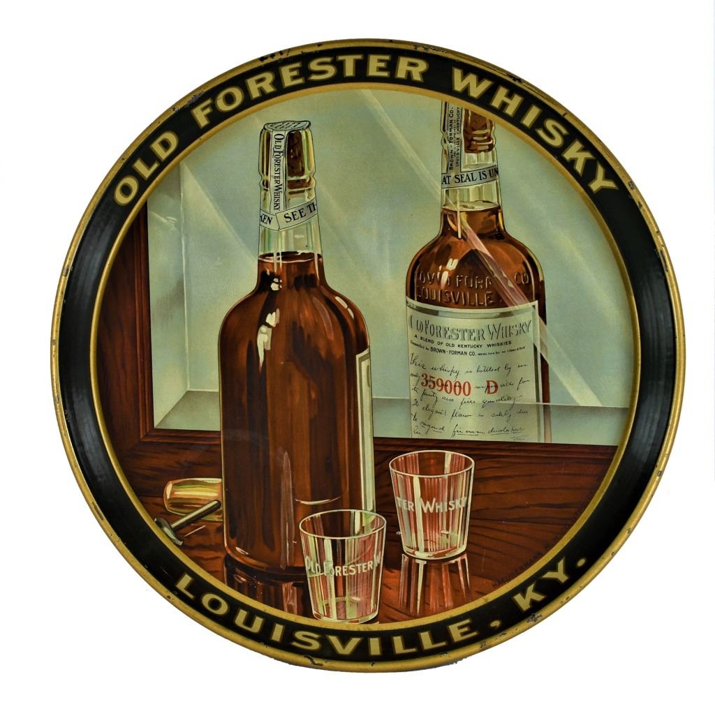 Old Forester Whisky Tin Serving Tray. Louisville, KY. One of the better "Bottle" trays out there. Excellent Condition. 12 inch diameter.