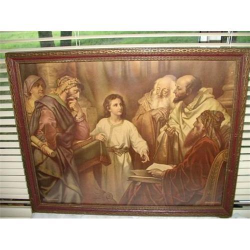 Old wood framed picture of Jesus Christ as a very young man, teaching in the temple. Framed size is approximately 16" x 20". Bought at an estate sale and exact age is unknown.