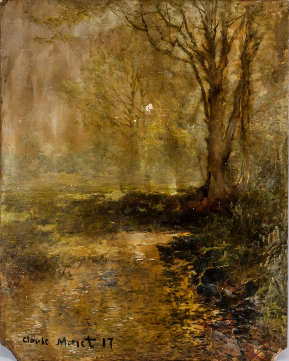 Oil on board. Featuring a landscape scene. Signed Claude Monet and inscribed 17 beside signature on the lower left corner. Label affixed to verso inscribed Oscar - Claude Monet 1840-1926 and stamped Galerie Beyeler PARIS. Also inscribed 4835 on verso. Inscribed illegibly on verso. 35 x 27 cm (13.75 x 10.5 inches). PROVENANCE: Private European collection