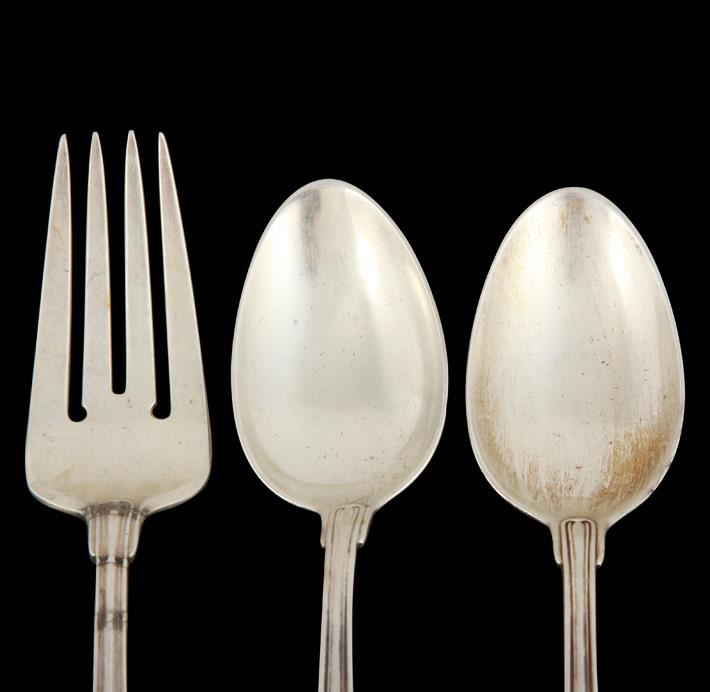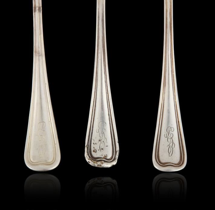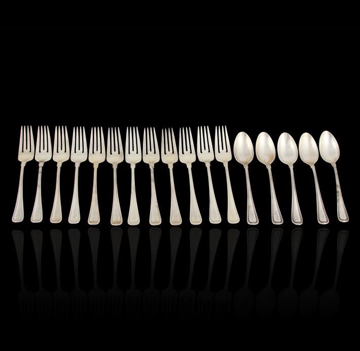 "Old French" pattern by Gorham. The is (17) piece lot of antique sterling consists of: (12) salad forks 6". (5) teaspoons 5.75". Monogram OCB beautiful period script. Great estate condition.