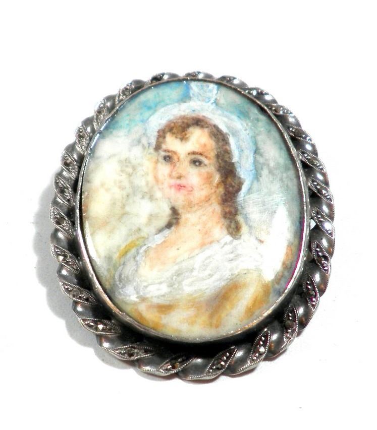 Old French miniature brooch, first half of the 20th century, embellished with a hand-painted girl figure, frame is set with mararcasites, tested silver, weight: 13.7 gm, dimensions: 3.5x4.5 cm.