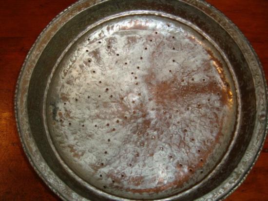 Old brass(?) strainer sieve probably made in late 1800's and used in southern France. Diameter-15"/ h-3.5". This piece is in good condition and was hand-hammered as you can see on photos. For the shipping, don't worry, we ship from Texas (not from France)!