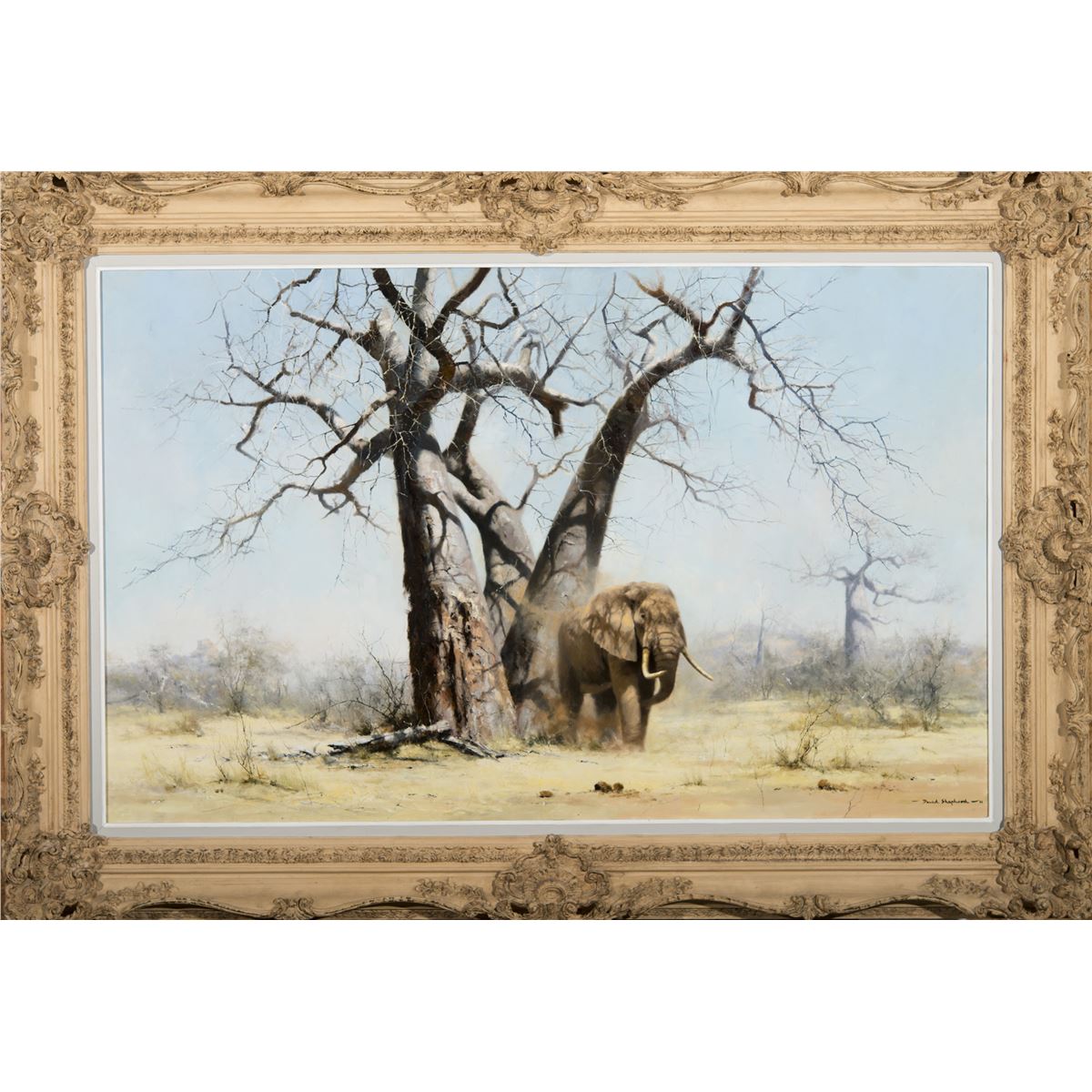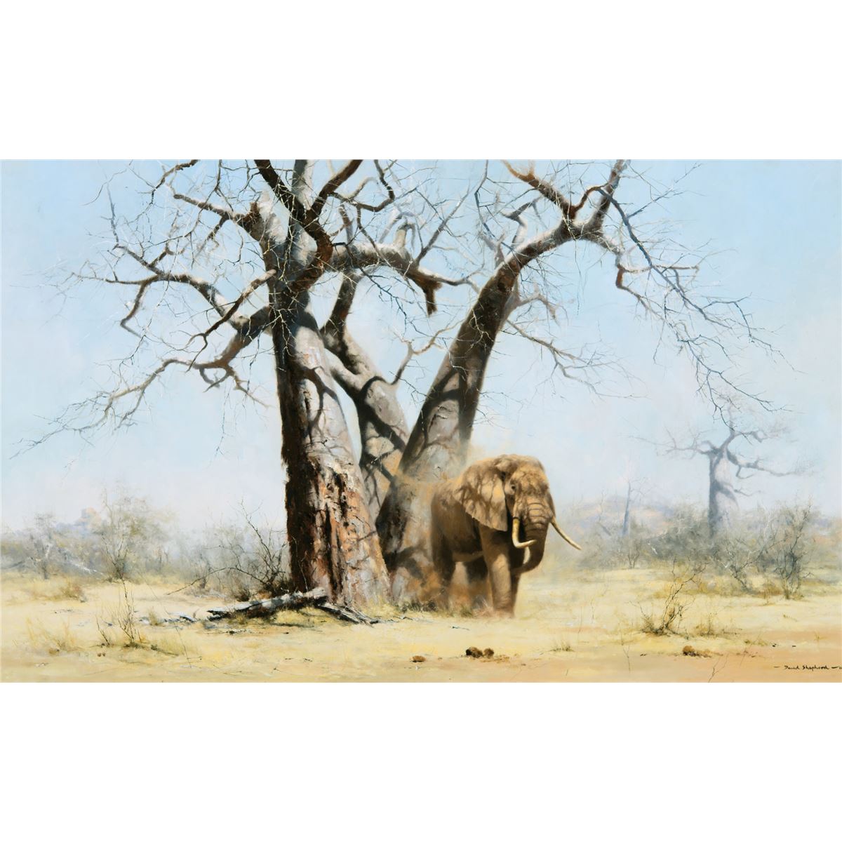 Though he was born in Britain, David Shepherd has spent a lifetime painting and advocating for the great game animals of Africa. He founded what has become a vital African wildlife foundation and was awarded the Order of the British Empire for his efforts. In Old George Under His Favorite Baobab Tree, Shepherd injects a bit of whimsy into the natural world. The venerable tusker and baobab are old friends. Places where George has scraped away the bark and scarred the tree are evident on the leftmost trunk. The relationship between elephants and baobabs is a sort of arms race of giants. The elephant gouges the outer bark of the tree to get at the watery, spongy mass inside, while the baobab regrows its bark and sends new shoots into the dusty earth—each strives to wear down the other. As well, the elephant eats the baobab fruit, digesting everything but the seeds, and thereby propagates the species. Because of the similarities in color and texture, baobab trees are sometimes called the elephants of the plant kingdom.
