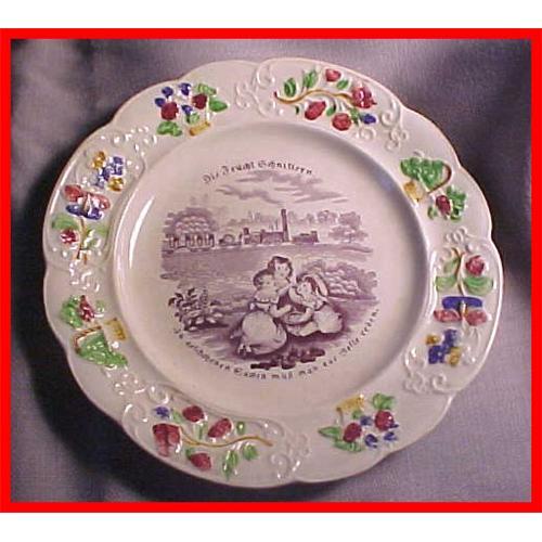 This antique 8" in diameter baby plate has a transfer decoration of children and a train. There is wording on the plate - looks like German. There are some colored highlights on the floral border rim. There is an impressed stamp on the back; but cannot read. Good condition with slight scuffing and staining; no chips or cracks. I would guess the age as circa 1900.