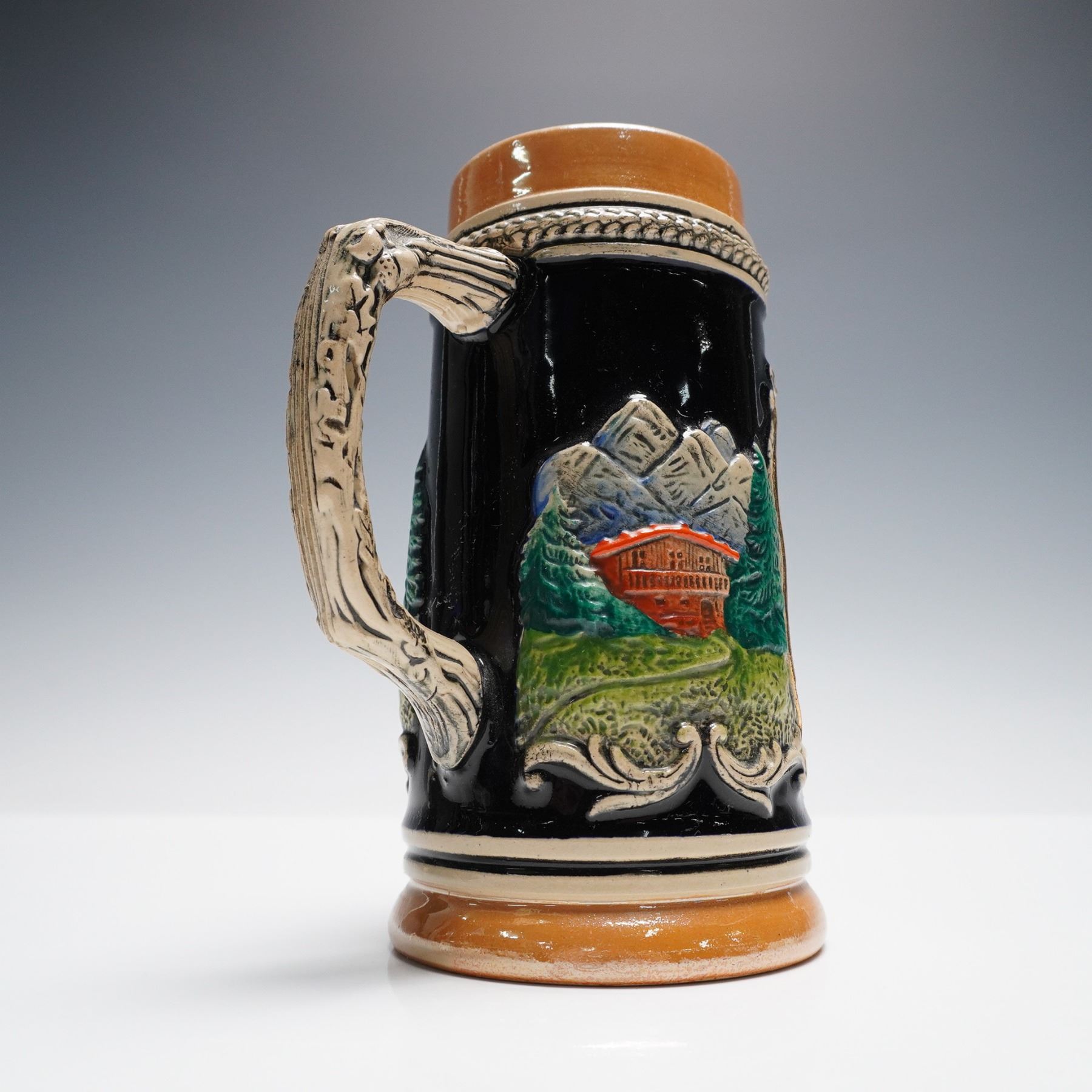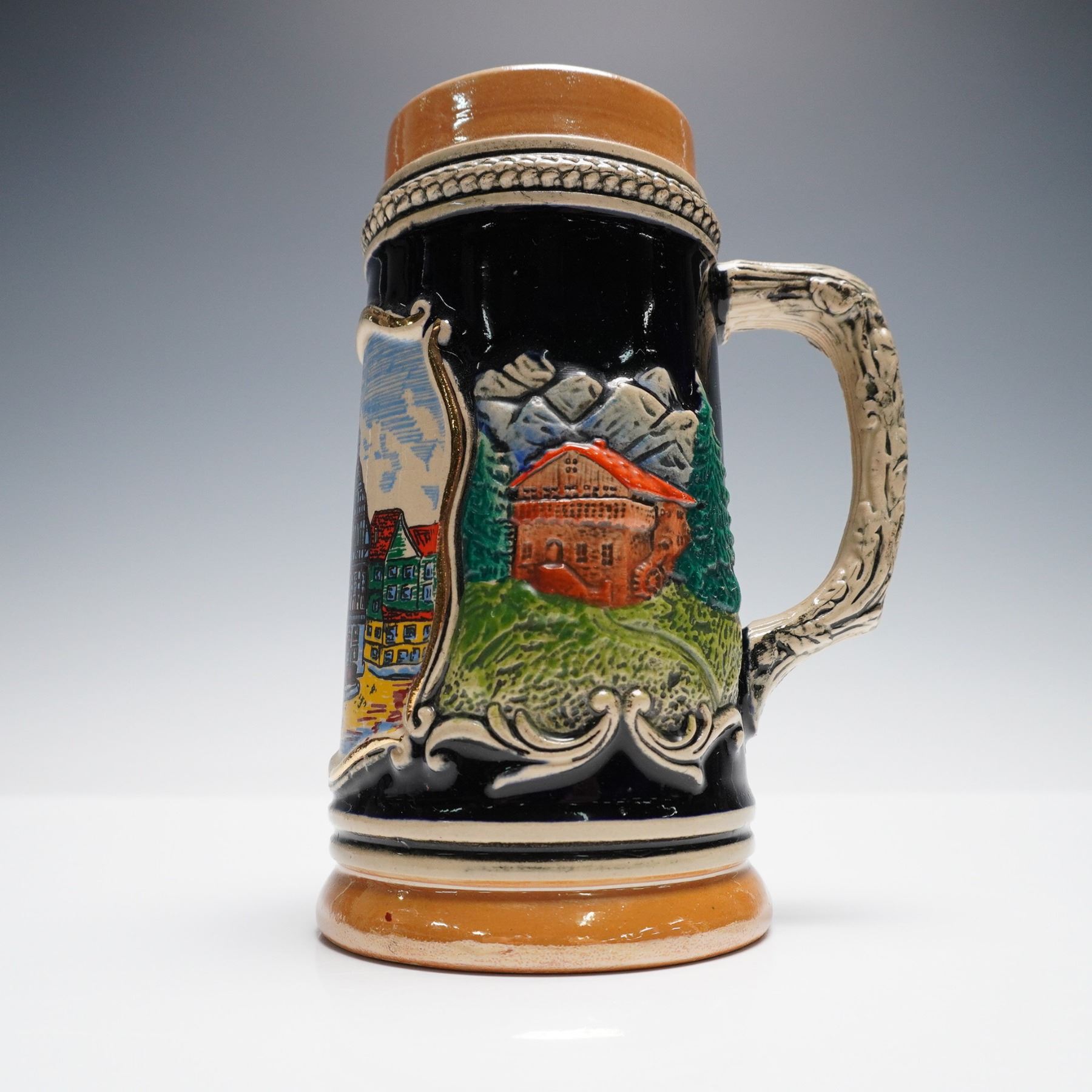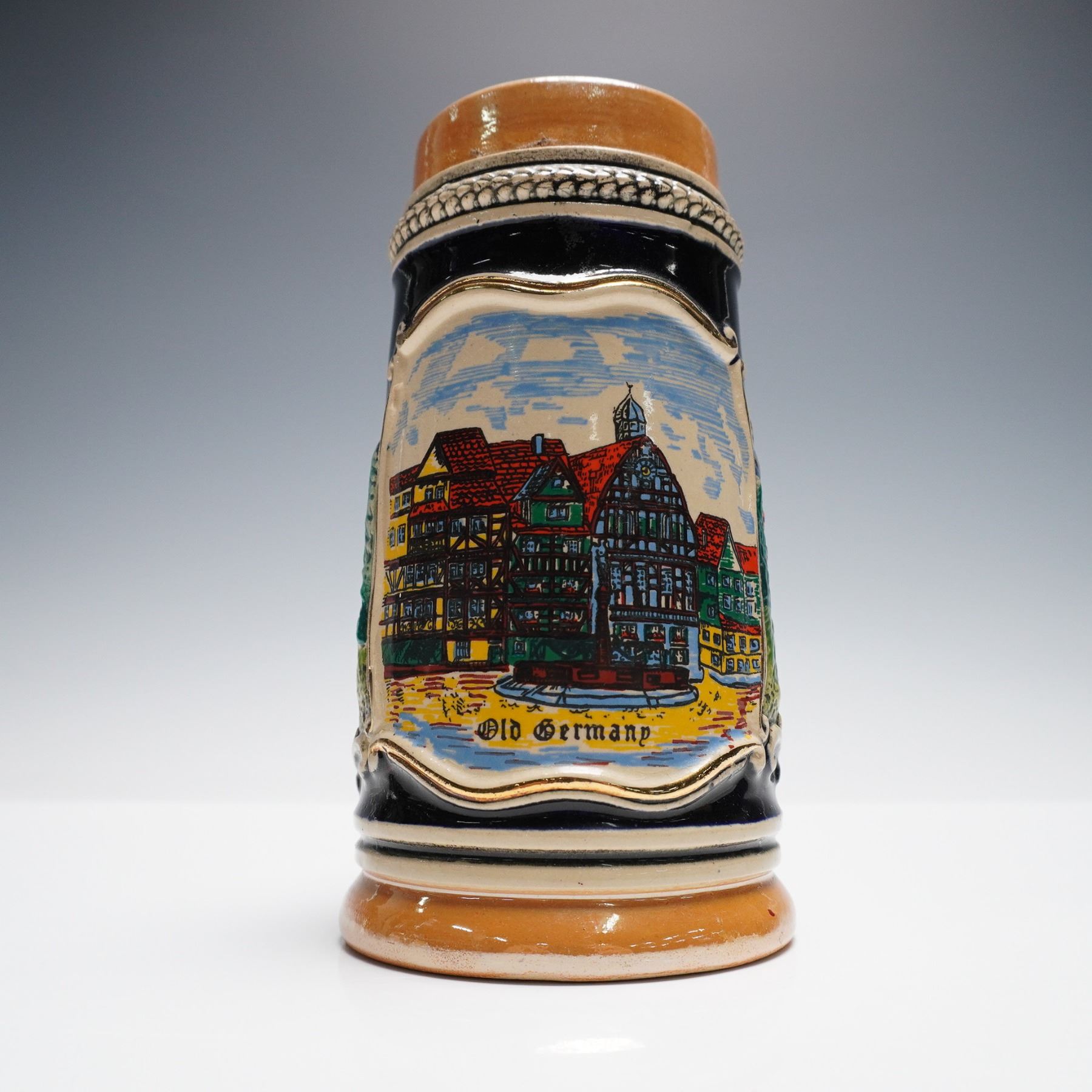 Handcrafted German beer stein featuring a colorful relief scene of traditional timber-framed buildings labeled Old Germany, flanked by Alpine chalet and mountain cabin motifs. The stein exhibits a raised design with vibrant enamels and a tree bark-textured handle. A nostalgic tribute to Germany's architectural and mountainous heritage.