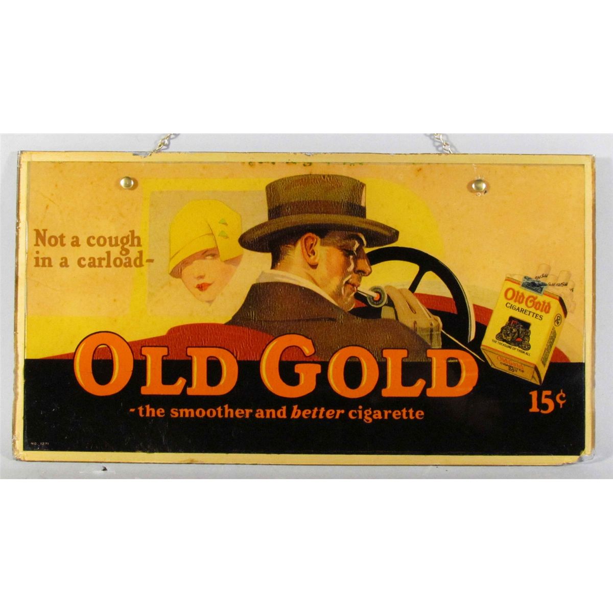 Old Gold Reverse Glass Chain Hanger Sign. Some age discoloration otherwise very good condition. 14 X 7 1/2 inches. Start Price $50
