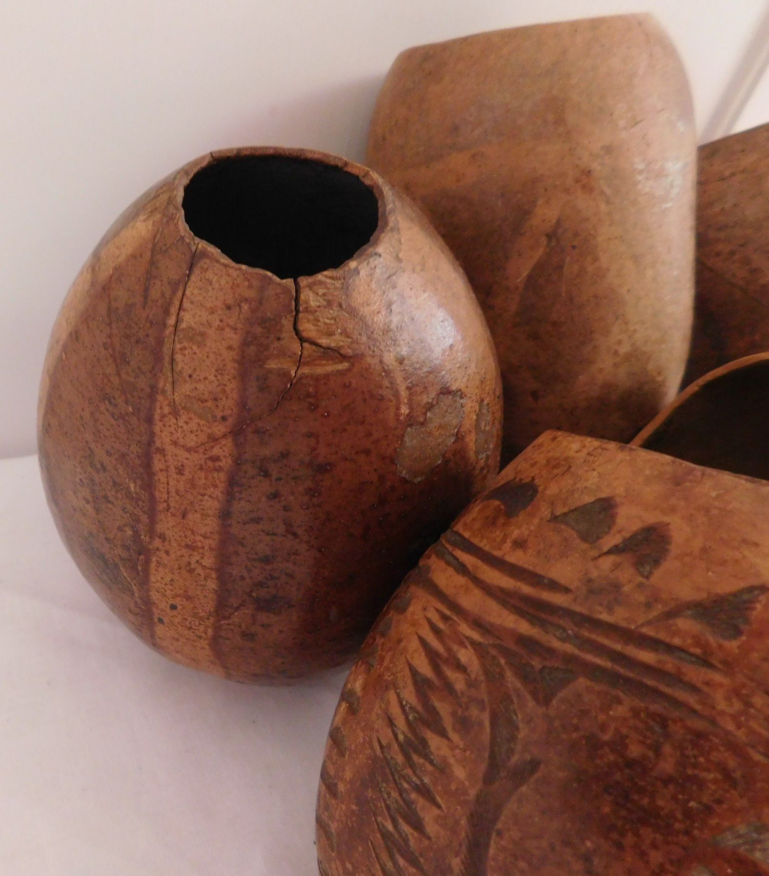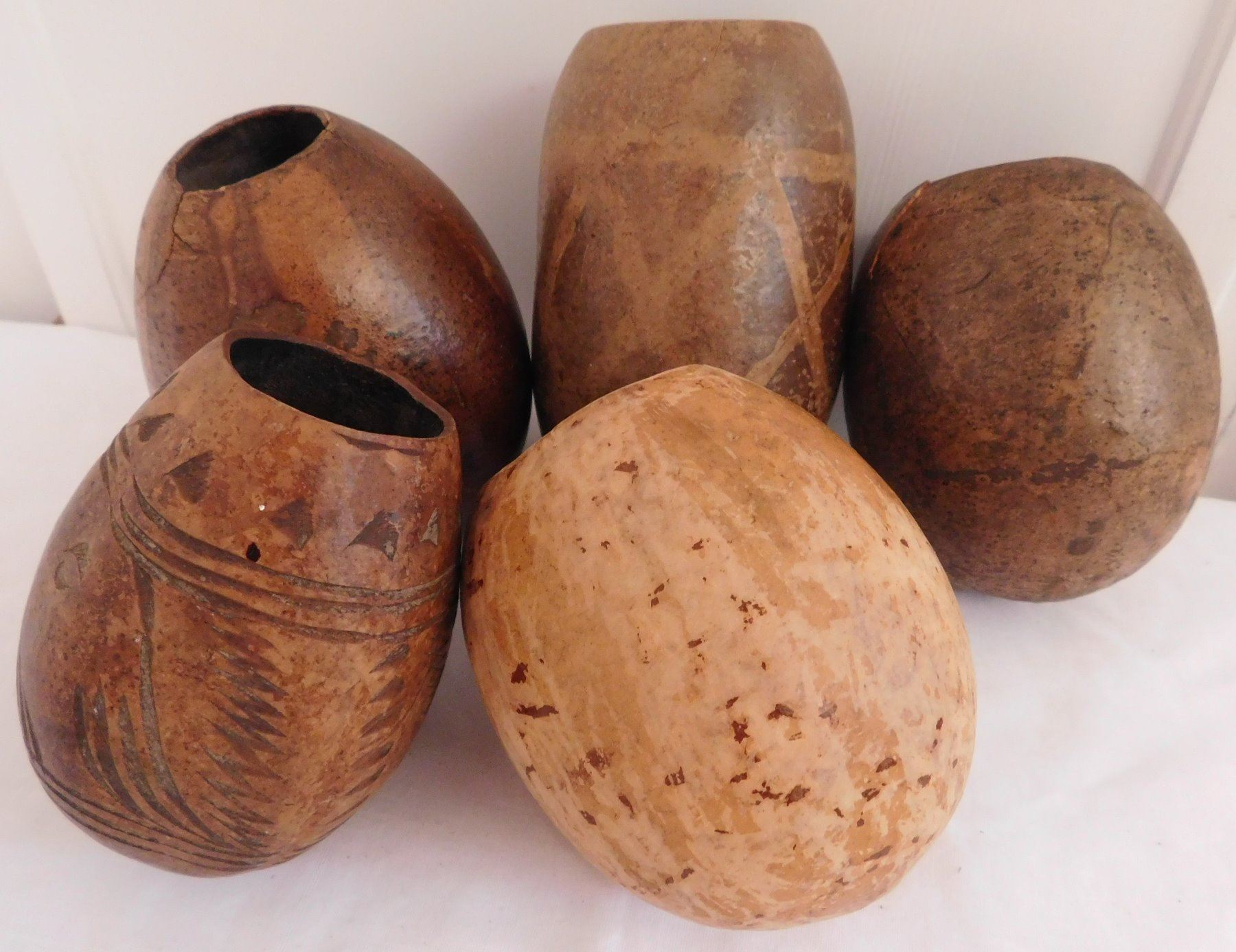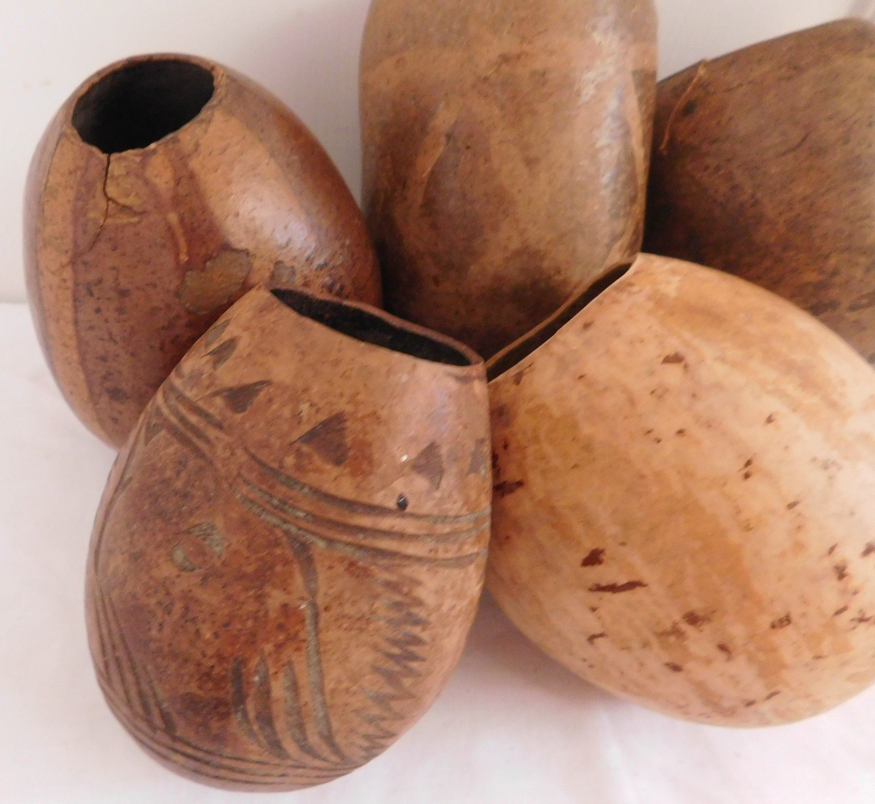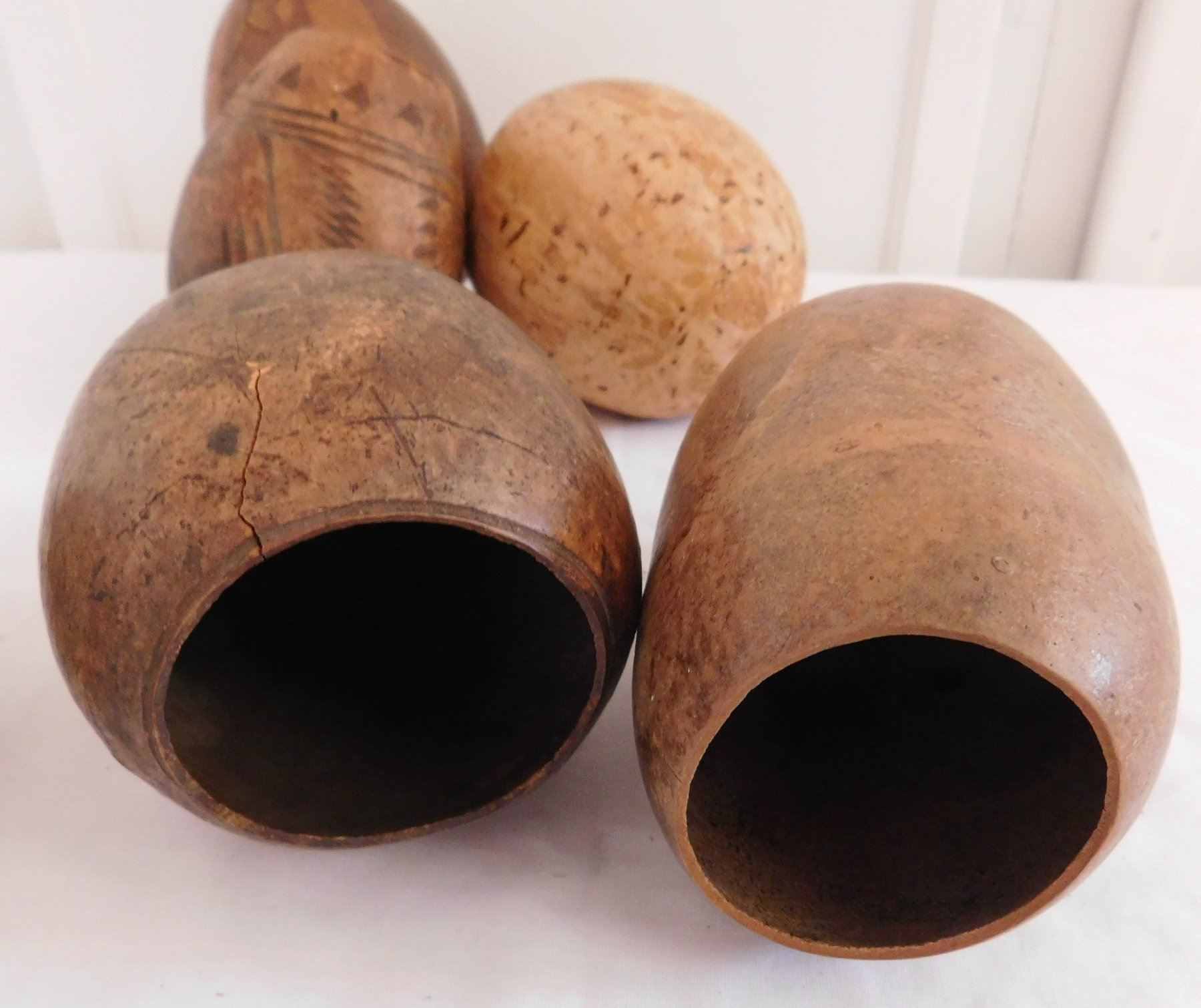 Old Gourd Collection, circa 1900s. Made of gourds, the items measure from 3.5" to 5.25". South America. 6 carved and stylized gourds used as containers. Condition: As found, see images. Shipping: $25.50 w/insurance and signature.