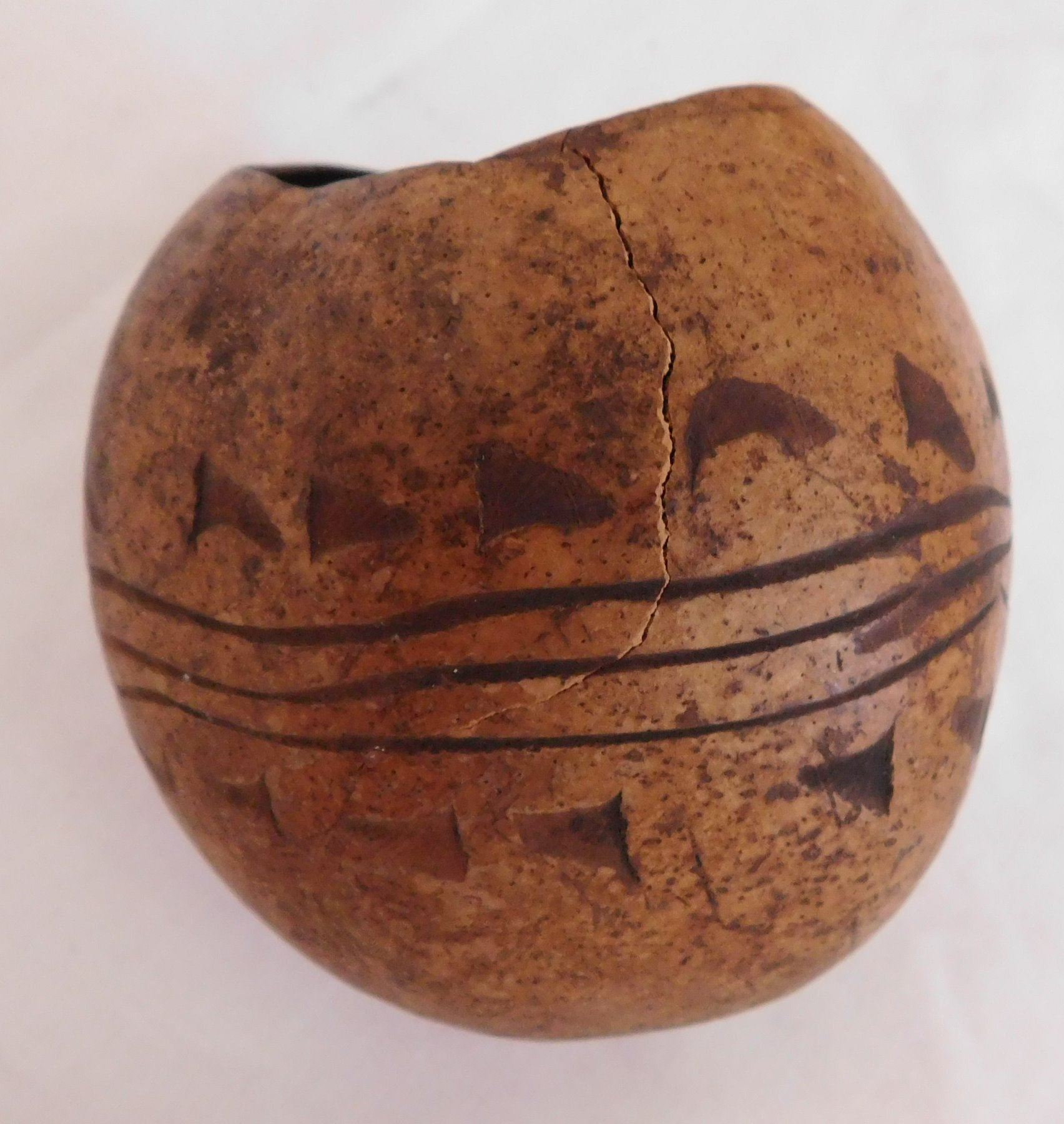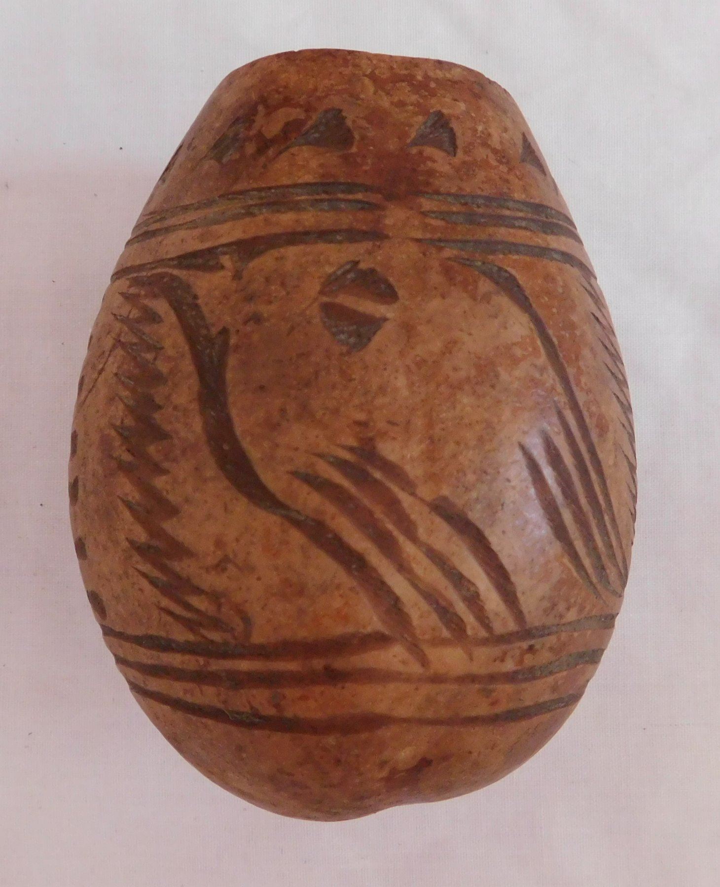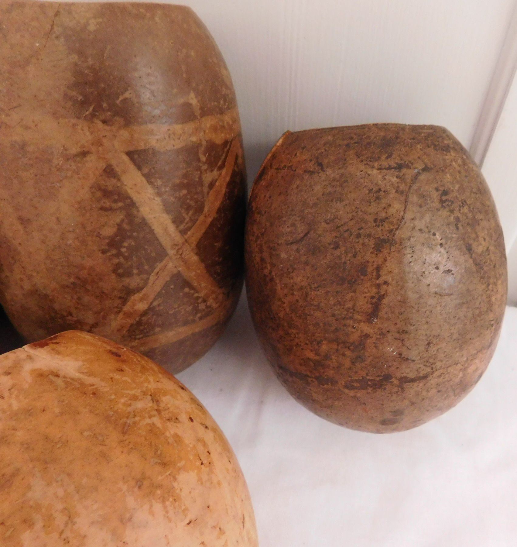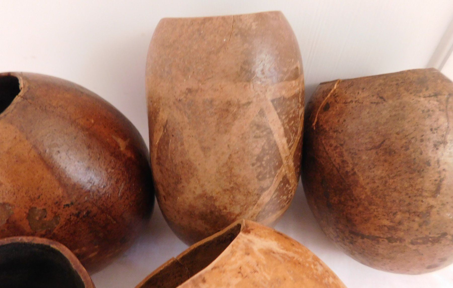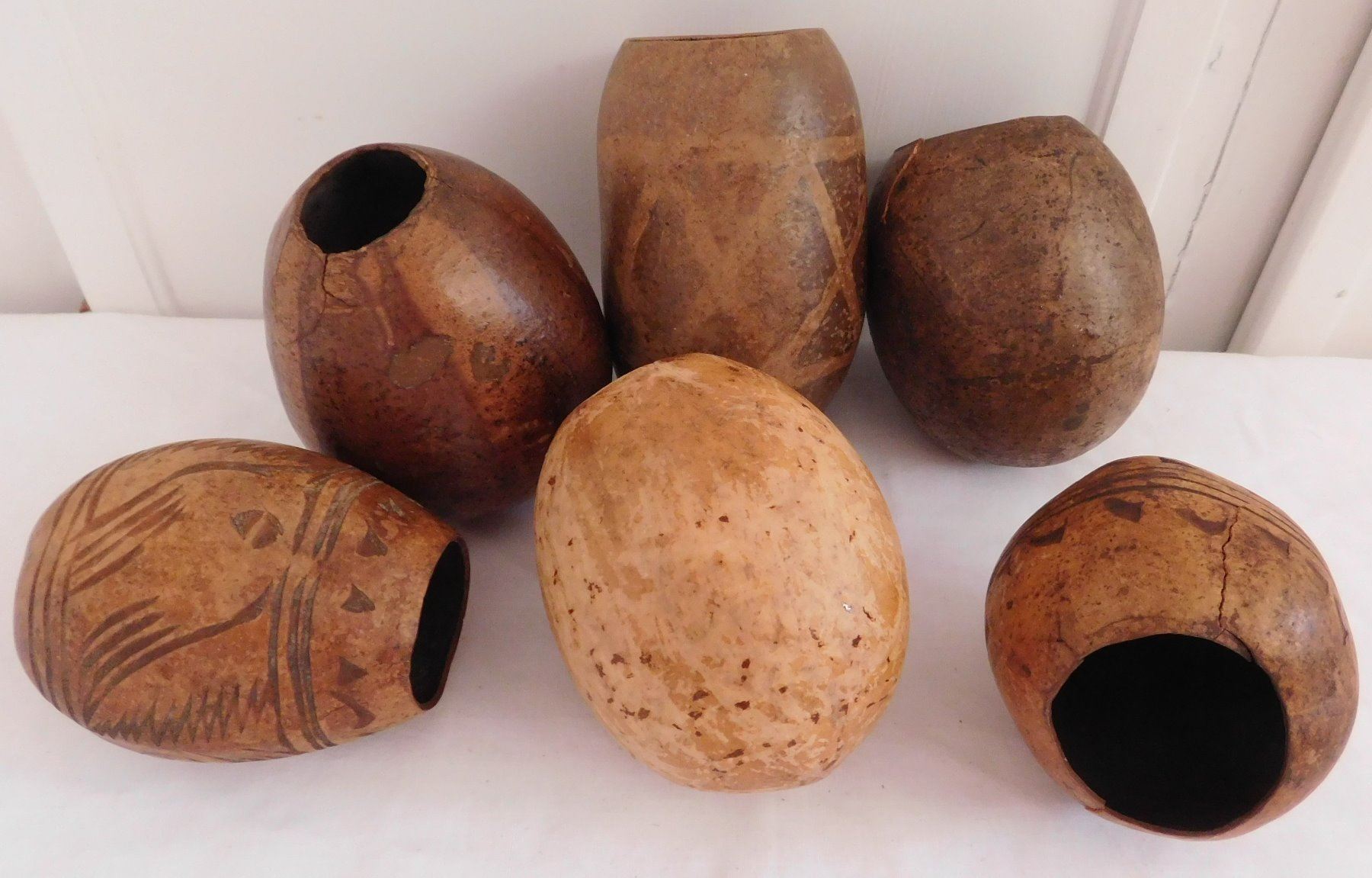 Old Gourd Collection, circa 1900s. Made of gourds, the items measure from 3.5" to 5.25". South America. 6 carved and stylized gourds used as containers. Condition: As found, see images. Shipping: $25.50 w/insurance and signature.