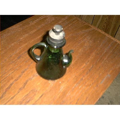 Old Green Spout Bottle with Cork/Wood Stopper. This is a dark green very old bottle, with a cork and wood stopper. You can see the age in it. A great add to any collection you may have. It is 5" H with Top and 4" from spout to handle. Base is 3" Diam. If you can look close at the photos, the top has a little slice in it, on the lip. It does not take away from the piece, but just want you to know about it. It is a very old one and such a very colorful one. Hope you like it.