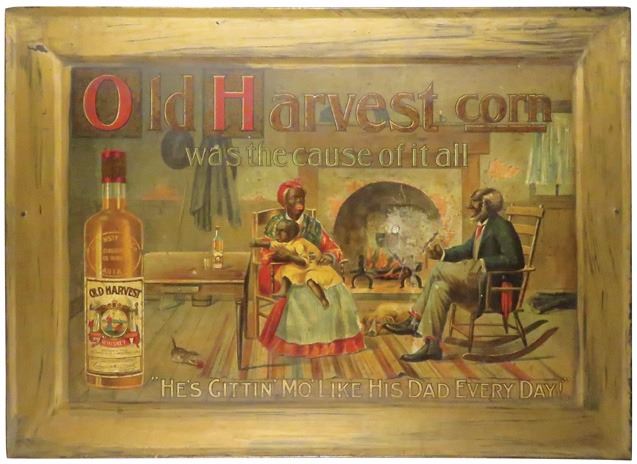Old Harvest Corn Whiskey Self Framed Tin Sign. "He's gittin' Mo' like his Dad every day". Great Black Americana image. Extremely rare but in poor condition. 22 1/4 X 16 inches.