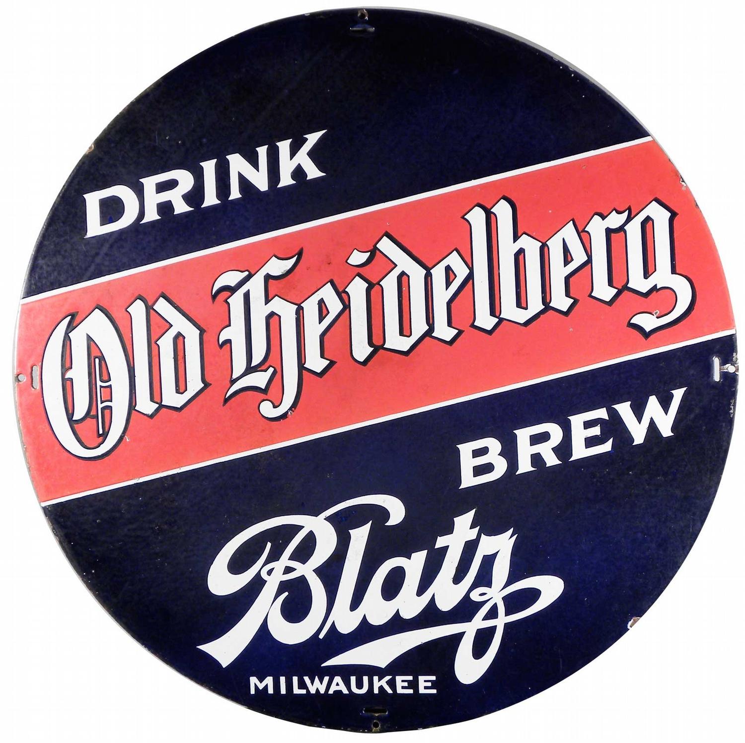Old Heidelburg Brew Porcelain Sign. Bottled by Blatz Brewing Co. Milwaukee, WI. Some slight fading and small chips around edges otherwise very good condition. 26 inch diameter.