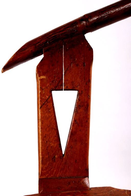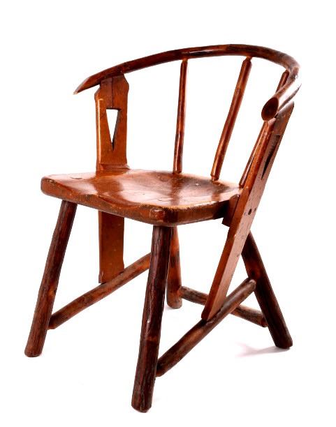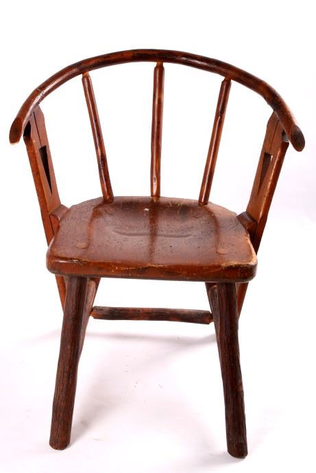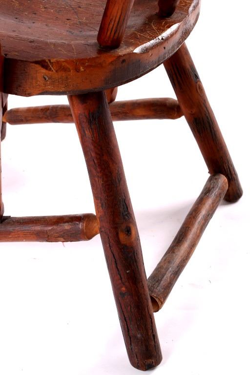 For your consideration is this circa early 1900 curve-back hickory chair, made by Old Hickory Co., Martinsville,IN. As the pioneers moved West in the 1800's, they discovered the durability, usefulness, and abundance of the Hickory tree in the Midwest, particularly in Indiana. It wasn't long before furniture builders started crafting furniture from hickory. It is said that a forbearer of the Old Hickory Chair Company made hickory chairs and rockers for President Andrew Jackson's home, the Hermitage. Once Old Hickory Chair Company incorporated in 1899, they were ready with a full line of products to ship. In 1904 the company shipped dining room chairs to the Old Faithful Inn in Yellowstone National Park. Those chairs are still in use today at the Inn. This chair features solid wood construction, including hickory legs and back. The chair is very solid and comfortable and has a nice rustic look to it. This example shows a very unique curved or bent back with stripped hickory wood and barked hickory wood having an added flair with the cutout accents for arms. The chair measures 25 1/2" wide x 20 1/2" deep x 29 3/4" tall.