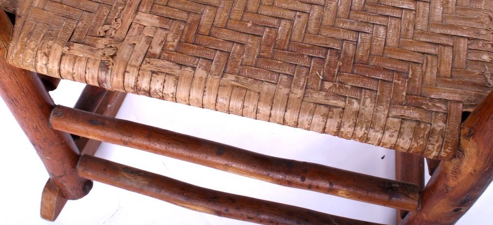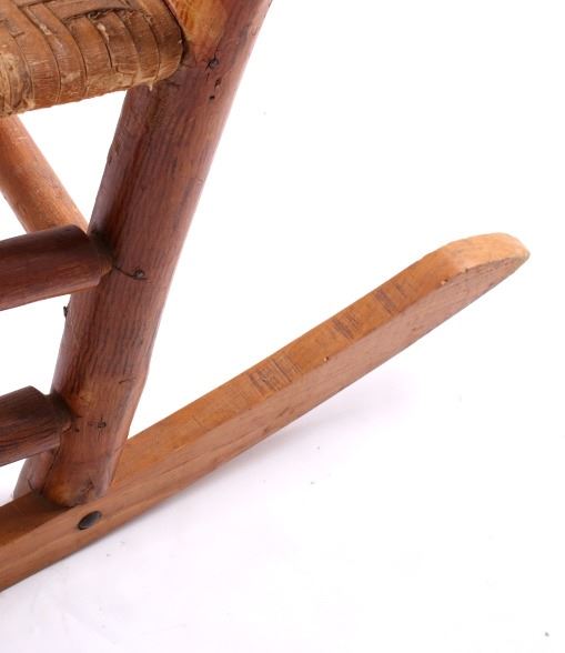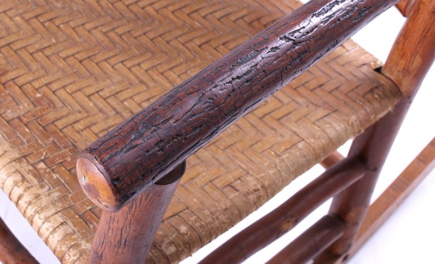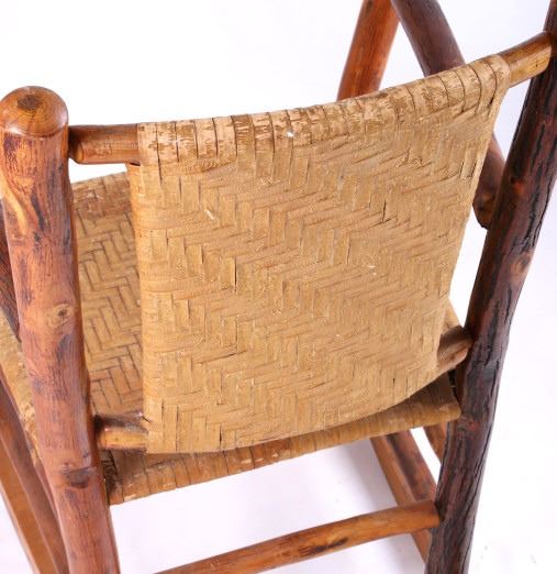 The lot features an excellent early 1900 Old Hickory hand crafted rocking chair made by the Indiana Willow Co. out of Martinsville, Indiana. The Indiana Willow Co. was formerly named the Old Hickory Furniture Co. and was ren-named and founded in the 1930’s. This chair shows the same design features and manufacture as the early Old Hickory chairs that it is modeled after, in fact this chair was probably made by the same individual and blue-print as the Old Hickory Rockers from the 1920’s. This chair features a fiber woven rattan seat and seat back and a beautiful hickory wood frame. There is a manufacturer's label on the bottom warning regarding the chair not being water resistant. The chair is in good condition for age (some wear on seat) and measures 33" tall by 24" wide by 32" deep.