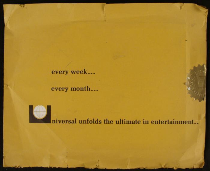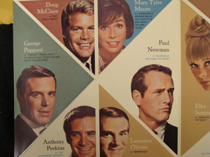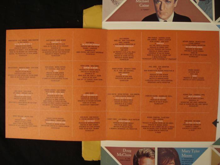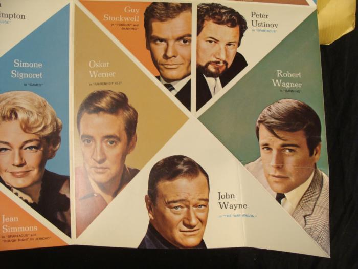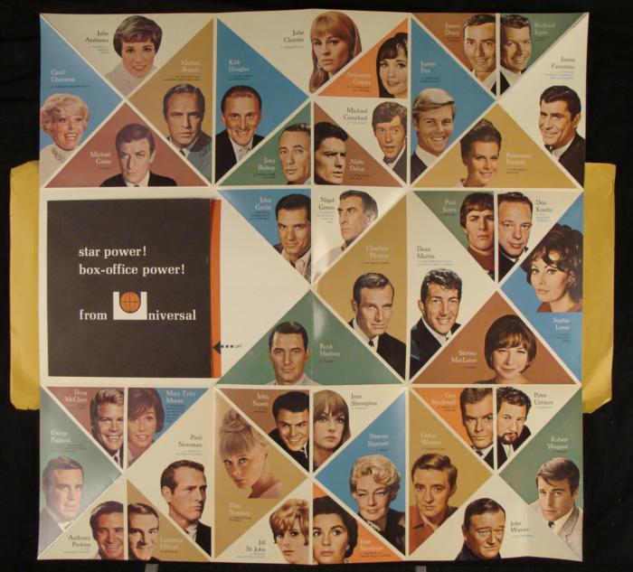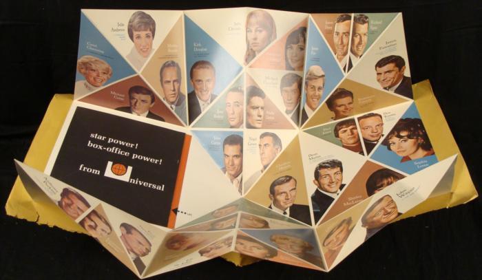 This advertising piece was made for Universal Studios to promote their latest big pictures, and to highlight their big time stars. It has a unique design, with accordion style fold-out that's attached right to the envelope. On the outside it tells how Universal "unfolds" its entertainment, and the edge has a gold embossed Universal Studios seal. Open it up to see it's "star power," with stars such as Michael Caine, Shirley MacLaine, Paul Newman, and more. The 13" x 16" package expands to an astounding 28" square. It is in excellent condition, aside from normal wear to the envelope, and a small crease around the picture of John Wayne. It is undated, but judging from the movie titles it dates from the late 1960's.