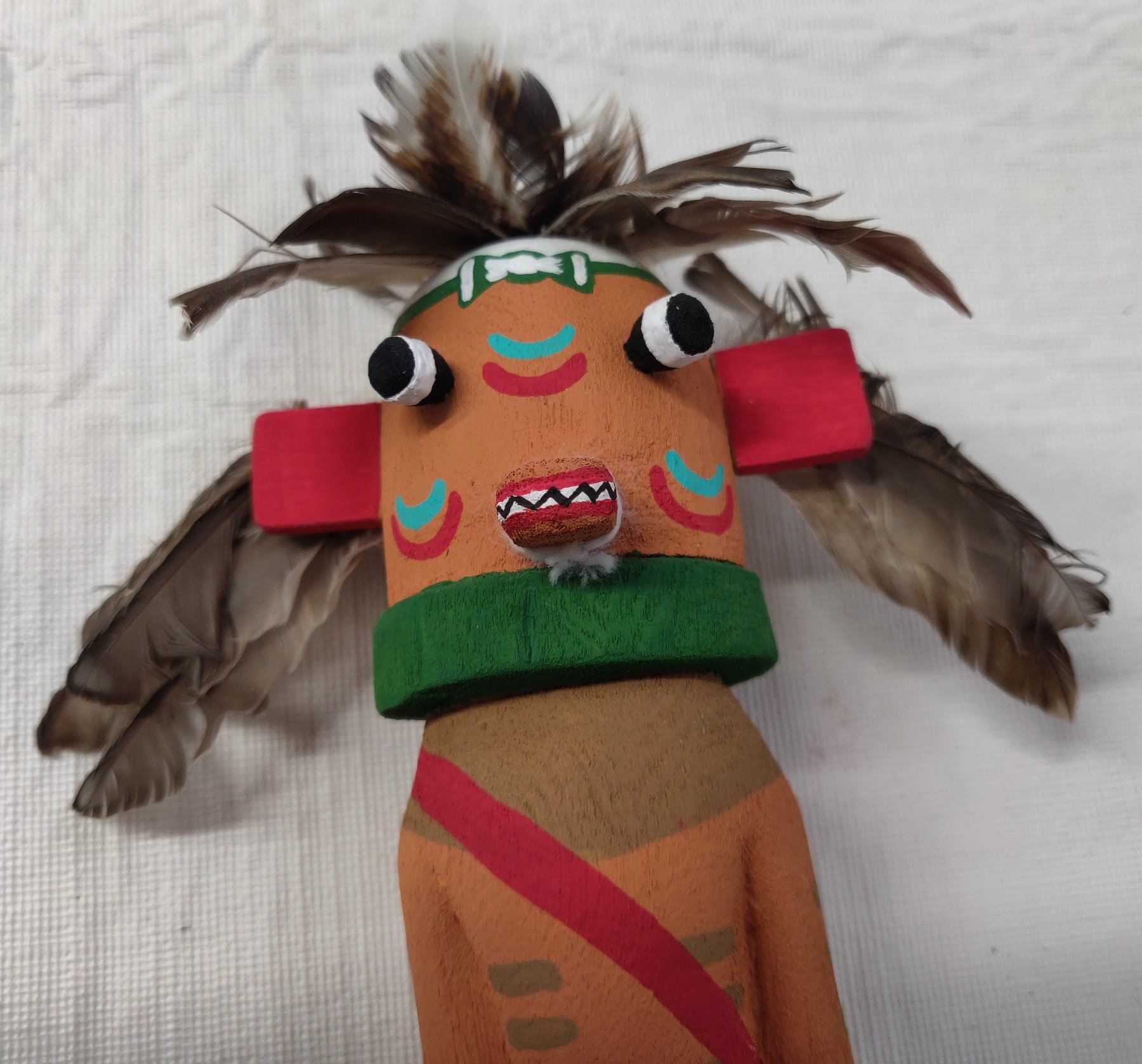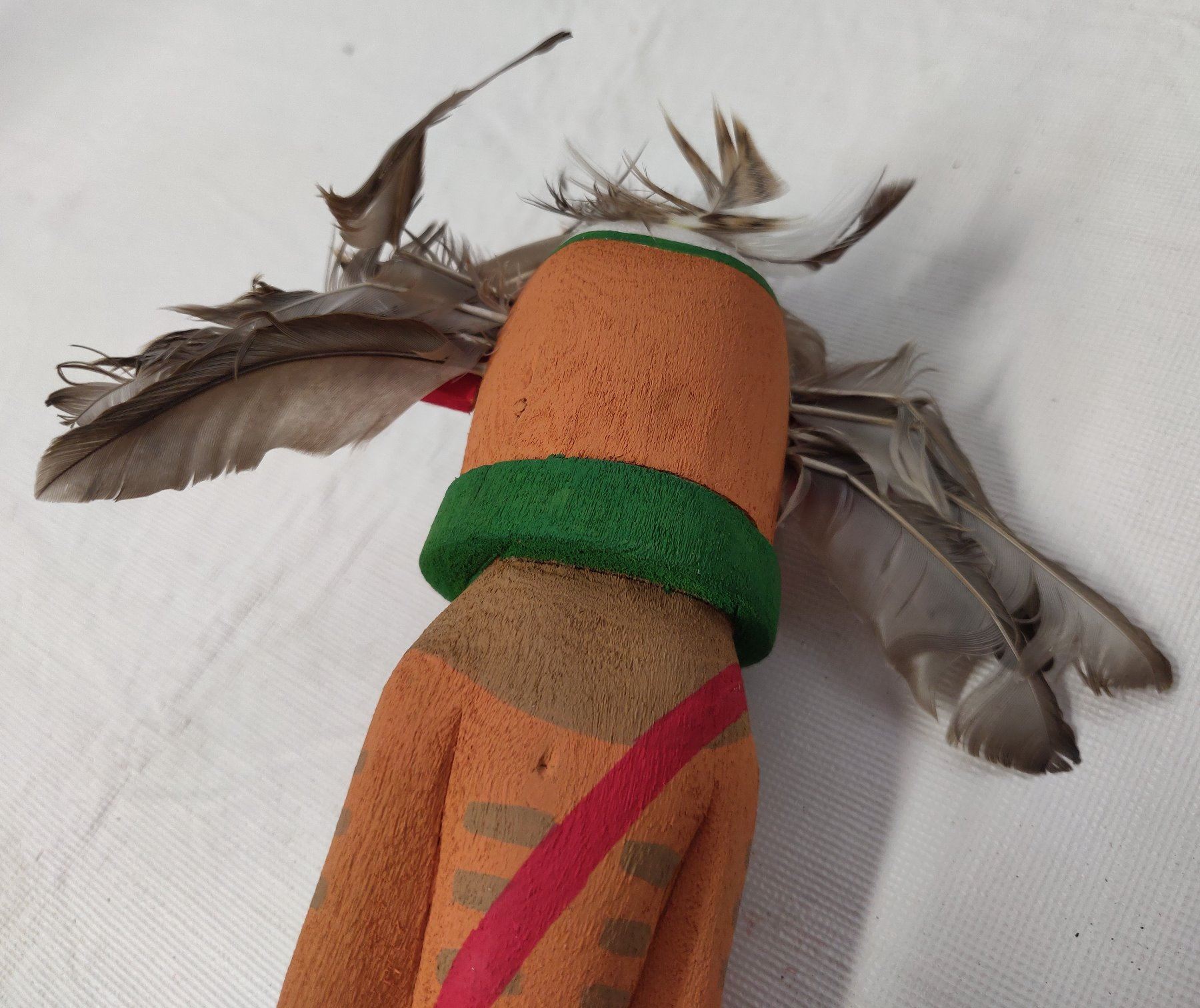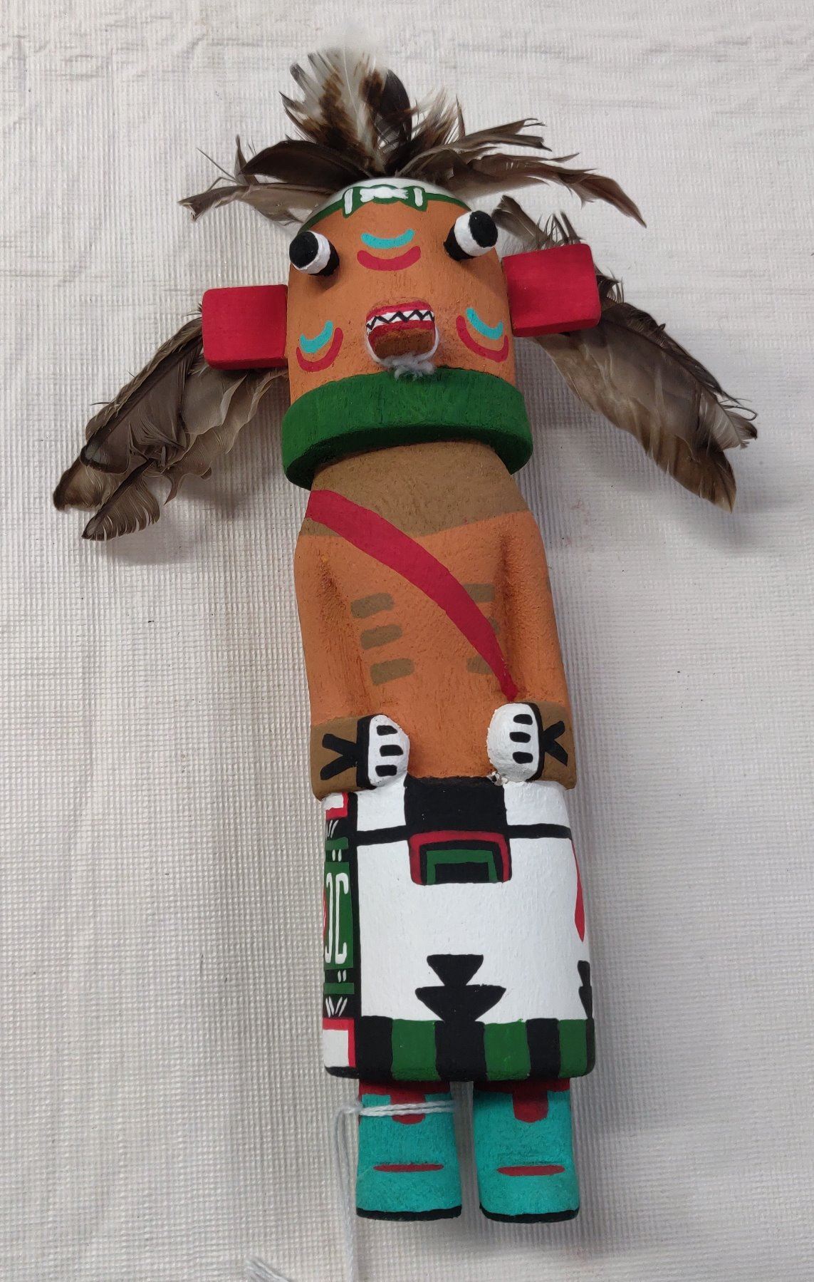 Old Hopi Kachina Doll, c. 1930s. Made of cottonwood, paint and feathers, the item measures 9" x 3". Northern Arizona. Condition: Good, see images. Shipping: $22.50 w/insurance and signature, due to value.