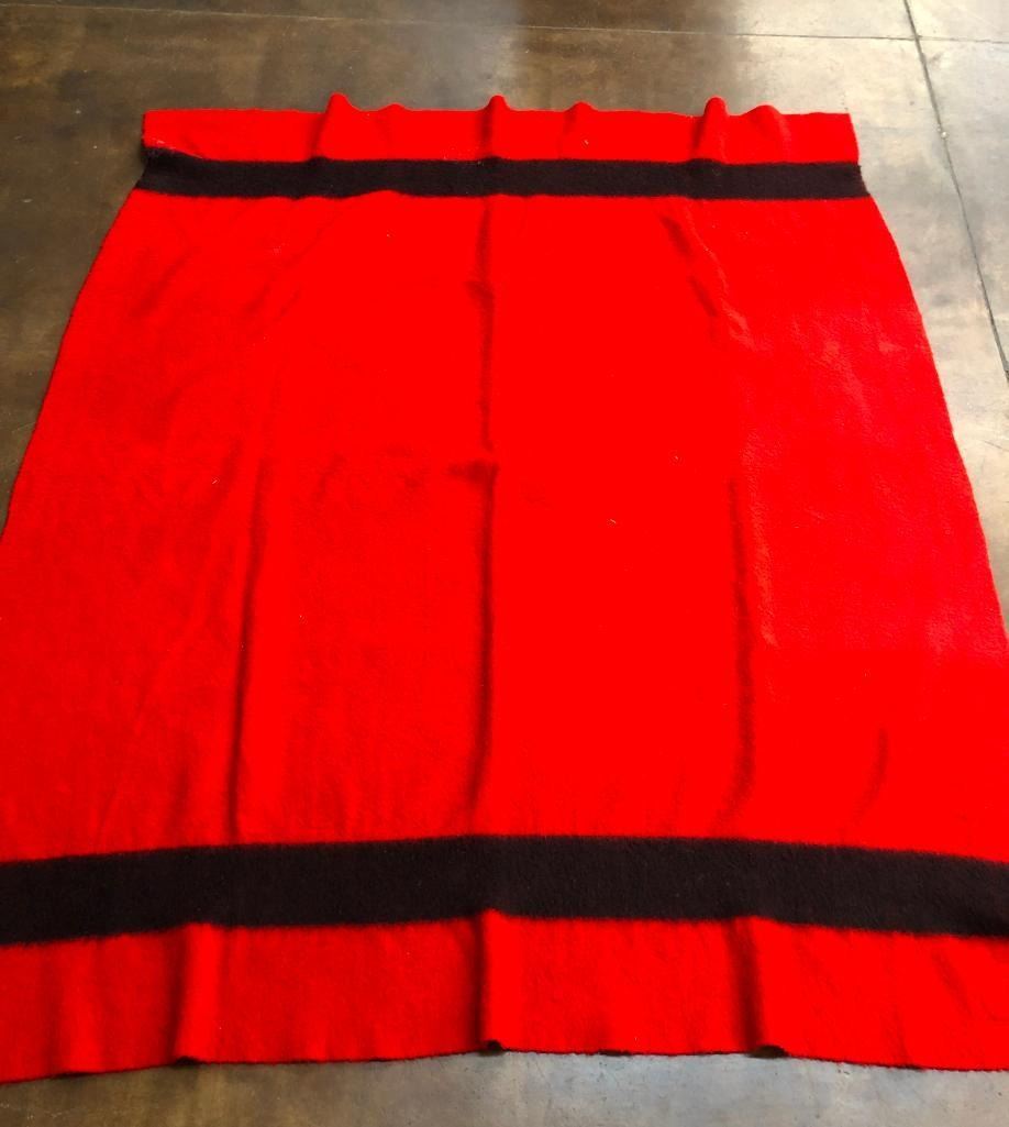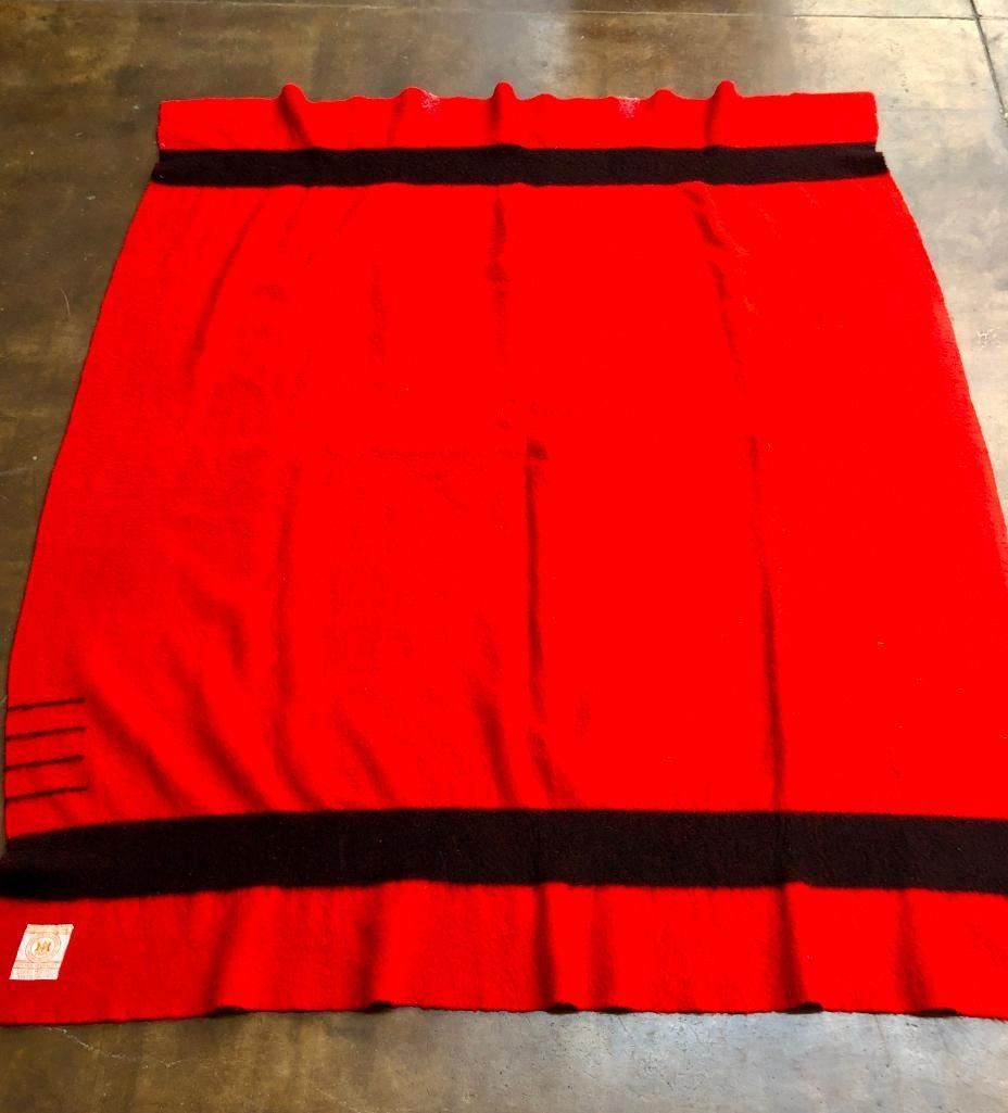 For sale in this lot is an old Hudson's Bay Point blanket. For well over two centuries, the Hudson’s Bay Point Blanket has been an iconic product in Canada and around the world. Hudson’s Bay Company has commissioned these fine English-made woolen blankets since 1780, many becoming heirlooms that are passed on from one generation to the next. The points, or small black bars on the side of the blanket, were utilized during the fur trade as an indication of size - a measure that continues to this day. Solid red blankets first appeared in the 18th century. Red was preferred by the coast and interior Salish First Nations in the Pacific northwest. MAKER: Hudson's Bay Company, England. APPROX AGE: Vintage. SIZE: 65 inches wide x 82-1/2 inches long. CONDITION: Good for its age, normal wear expected. Please look closely at the pictures as they are an important part of our description and are hereby incorporated into the description, specifically with regards to condition. SHIPPING: There will be a $8 handling / packaging fee for shipping this lot. The actual cost of postage will be added on top of that. BUY IT NOW: If you would like to buy this item now, without waiting for the auction day to bid on it, we do offer this option (which is available up to 48 hours before the actual auction starts). The “Buy it Now†price is the high estimate of this lot (plus applicable fees and the Buyer's premium is discounted to 10% when using the Buy it Now option). If you would like to exercise this option, you must contact us by email (or phone as long as you talk to someone live). Reference this lot number and your intention to "Buy it Now."