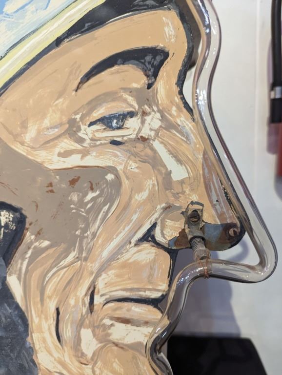 Old Double Sided Indian chief neon sign. Hand painted. 32" x 32" x 14.5" Came from the top of Tony's Curio Shop in Blackfoot Idaho.
