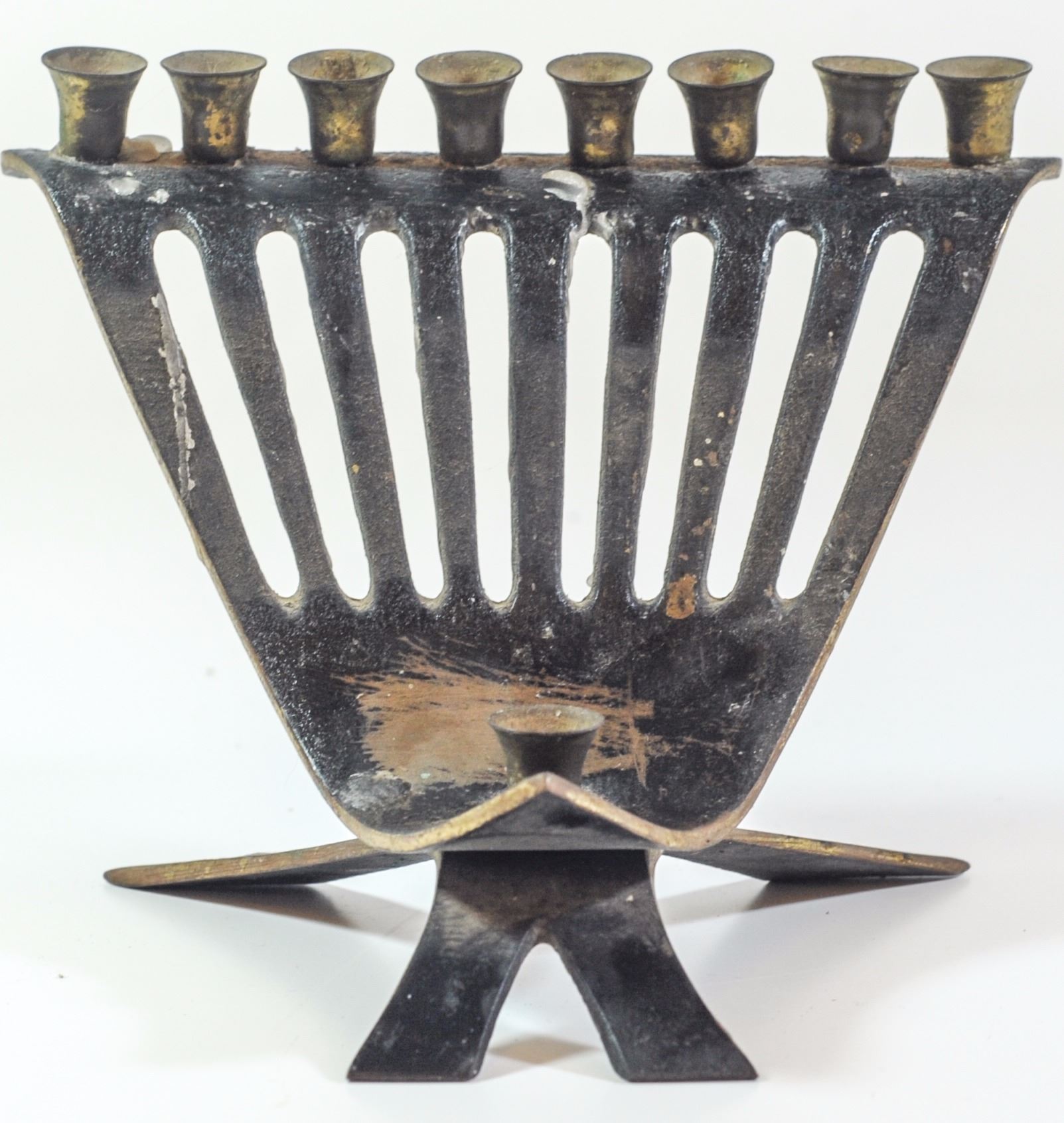 Old Israeli brass backplate Hanukkah menorah lamp by Dayagi, modern design, black patina, damage to patina, signed, height: 13 cm.