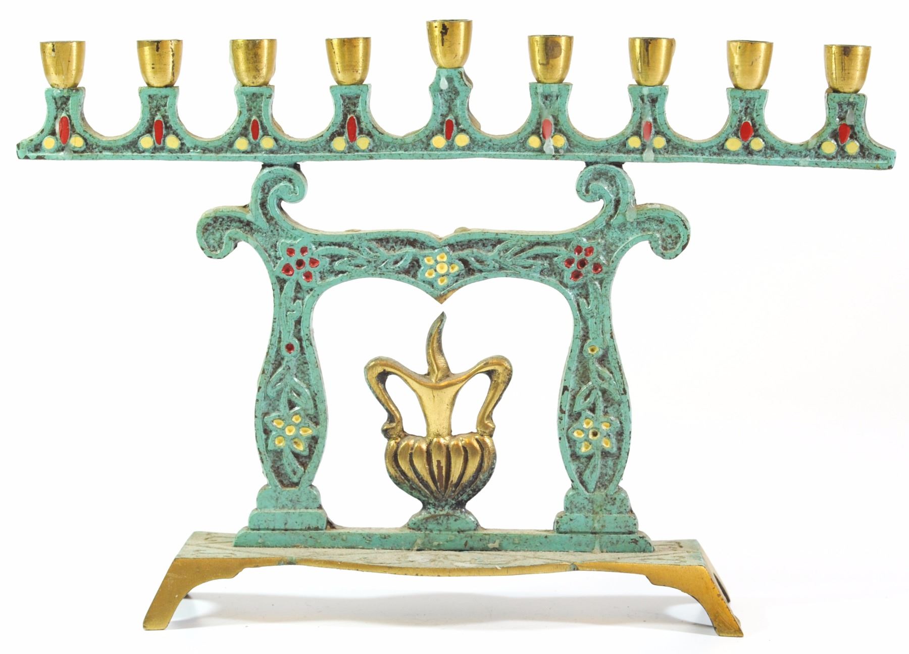 Old Israeli brass backplate Hanukkah menorah lamp, 1950s1960s, backplate embellished with the cruse of oil, green patina combining red and white dots, length: 22 cm.