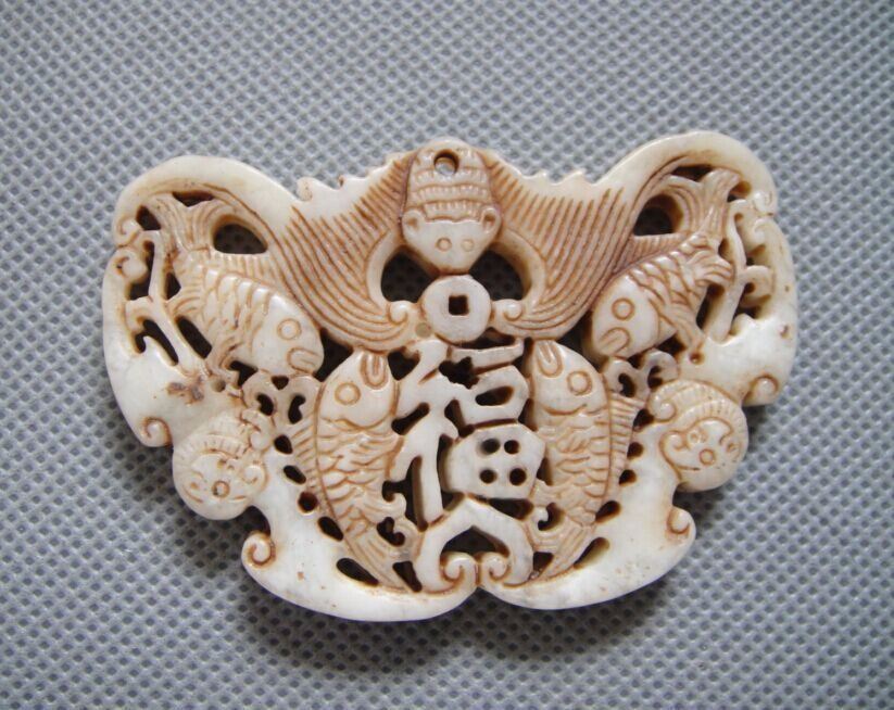 Old Jade Bat & Double Fish Pendant.............Height:68mm;Width:46mm;Depth:6mm;Weight:30g;