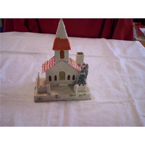 Old Japan cardboard church that is flocked.The steeple has been glued on(so as not to fall over I am sure) and is not the best job of gluing,but still very usable if you have a village of houses.Measures 5 1/2" across front bottom and is a little over 7 1/2" tall to top of steeple.Back has a area of paper loss but is still a sturdy piece(see pictures).