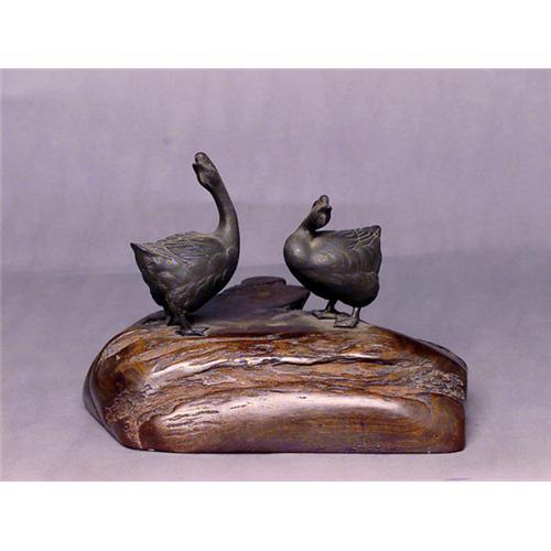 <tr><td>Title:Old Japanese Bronze Goose Bird Wood Stand</td></tr>