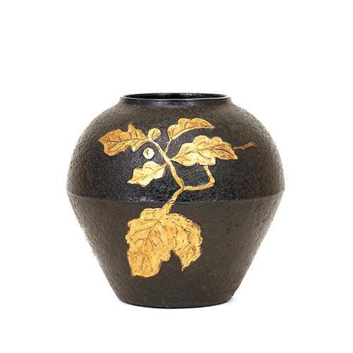 <tr><td>Title:Old Japanese Gilt Iron Jar w Leaf </td></tr>