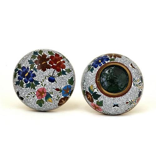 Old Japanese Goldstone Cloisonne Powder Box with Flowers <p> The box is 3 inches tall, and 4.5 inches in diameter. </p><p> It is in good condition with no repairs, chips, nor cracks. </p><p> Please email for more photos, items, and shipping costs. </p>