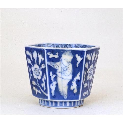 Old (1920's) Japanese Imari Blue & White Hexagon Cup with Boy Signed <p> The cup is 2.75 inches tall, and 3.5 inches wide. </p> <p>It is in good condition with no repairs, nor cracks, except chips at the foot (as seen in the photos). </p>