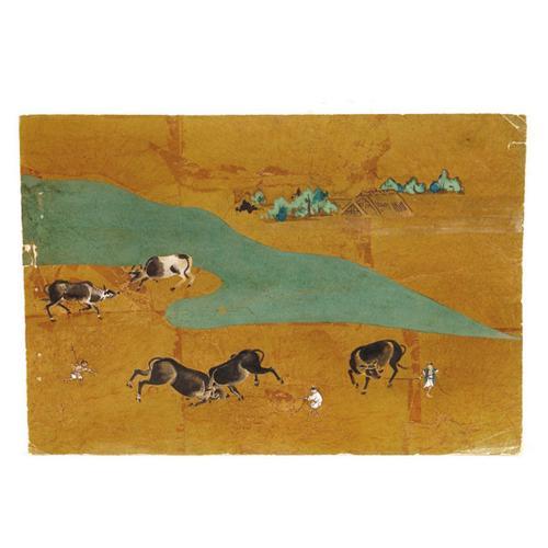 <tr><td>Title:Old Japanese Screen Leaf Gilt Painting Ox Scene</td></tr>