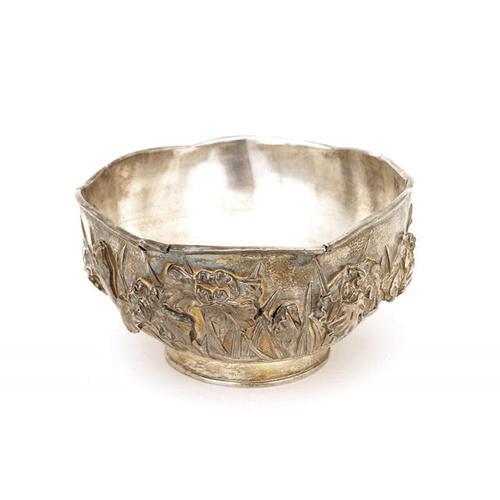 Old (1920's) Japanese Silver Repousse Iris Bowl Marked "Pure Silver" in Japanese