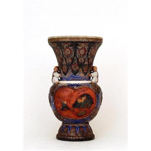 Old Japanese Tokoname Crackle Vase with Gilded Medallion Dragons and Sumida Gawa Style Figurines Signed <p> The vase is 14.5 inches tall, and 7.5 inches wide. </p> <p>It is in good condition with no repairs, nor cracks, except a small chip (0.5 inch in size) at the opening rim, and peeling of paints at the rim (as seen in the photos). </p>