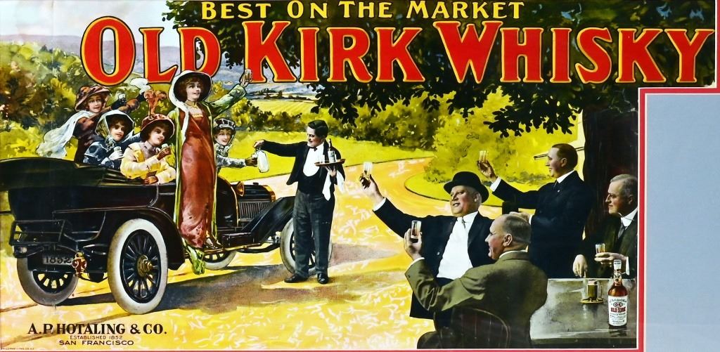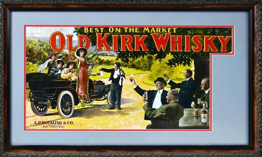 Automobilia whisky advertising printed by Galloway Litho Co. San Francisco. Framed measures 20" x 33.5"