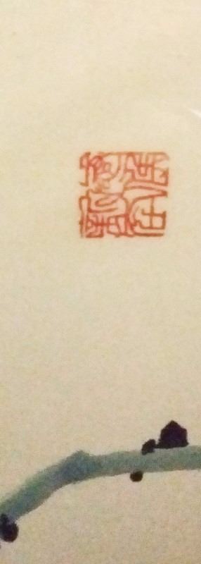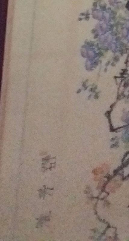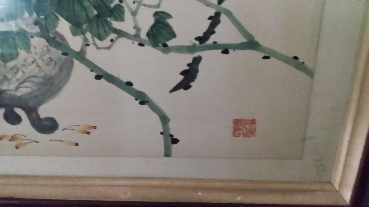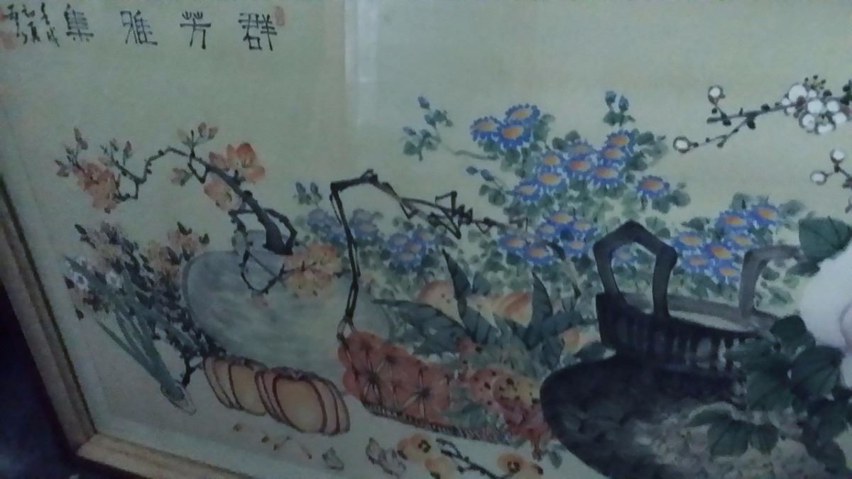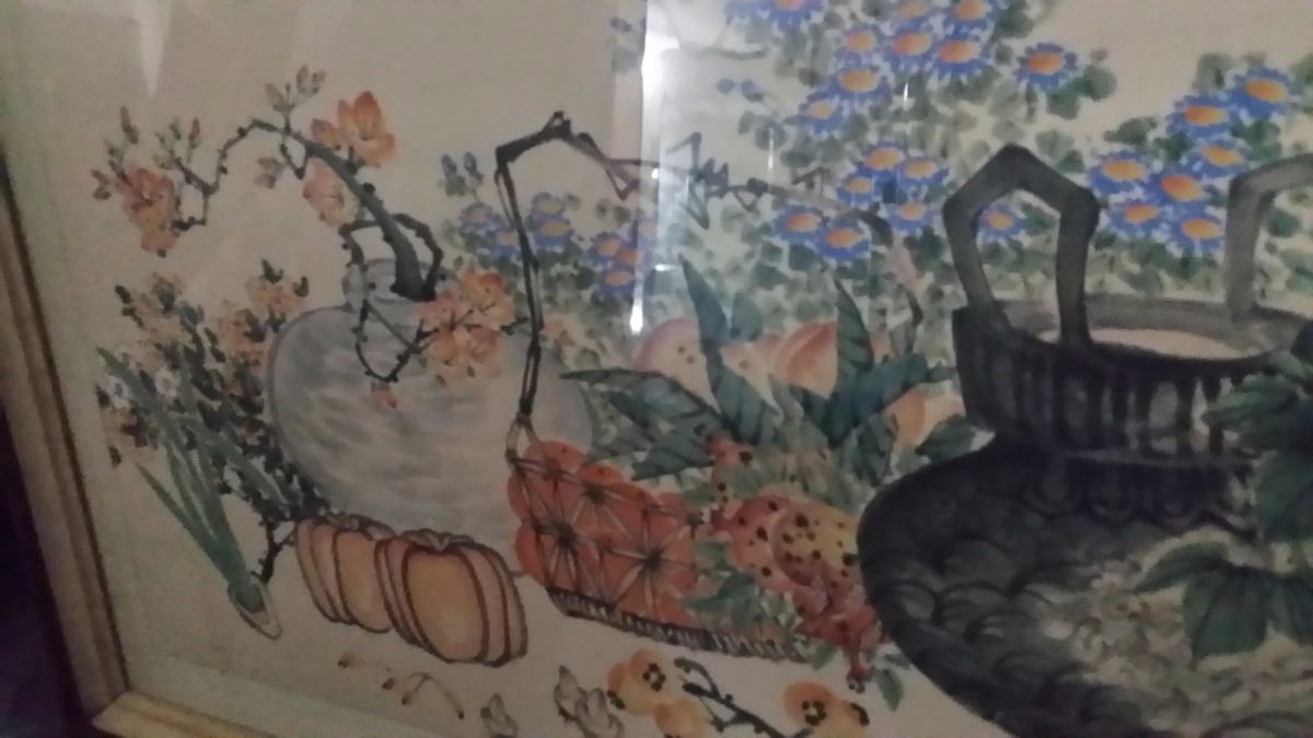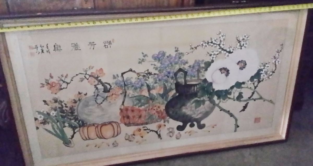 Antique-Vintage Korean Floral Bouquet with Bronze Incensor Scene of Ink & Color on Silk Paper Scroll Signed w. Seal Mark Matted and Framed 58x32"