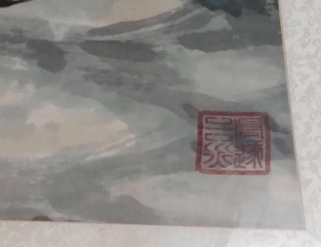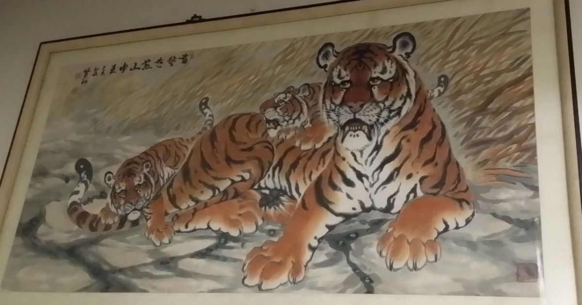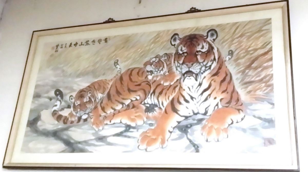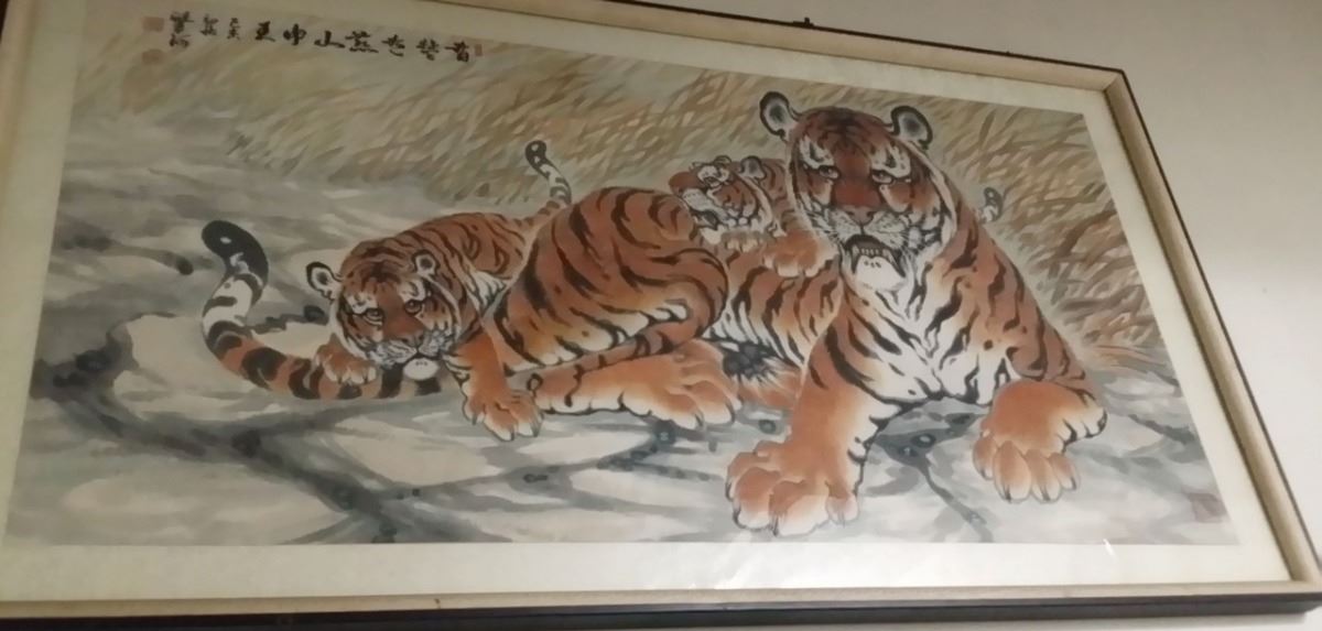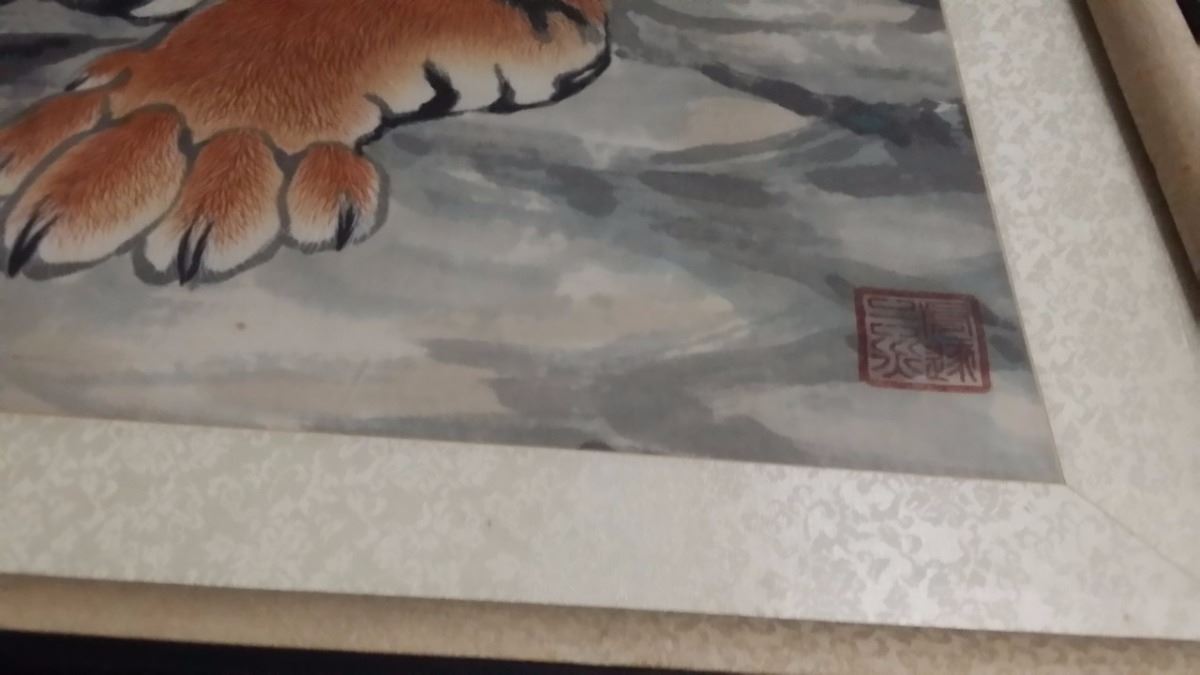 Old Korean Ink & Color on Silk Paper Scroll Signed w. Seal Mark (Group of Resting Tigers) Mark Matted and Framed.