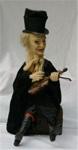 Automaton in the form of an old gentleman playing a violin. Figure sits atop an enclosed music box and makes motions for playing a stringed musical instrument while music plays. Eyes open and close. Large hands, broken little finger on right hand. Sep