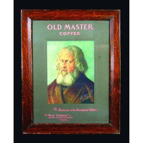 Old Master Coffee Paper and Cardboard Sign, the Bour Co. Toledo, Kansas City. In period oak frame. Has small stain at 2:00 otherwise excellent condition., 18 1/2 X 23 2/3 inches.