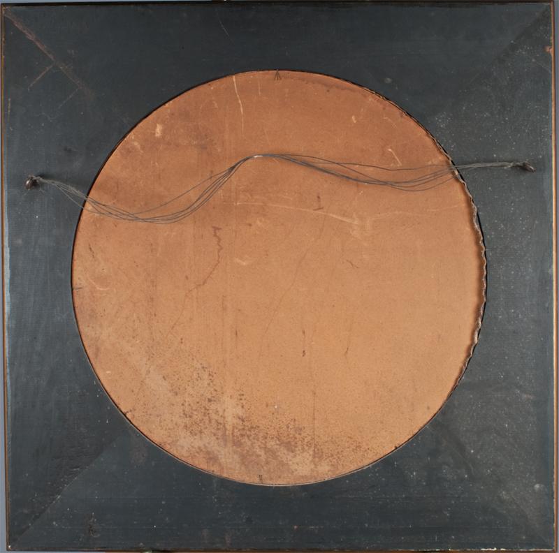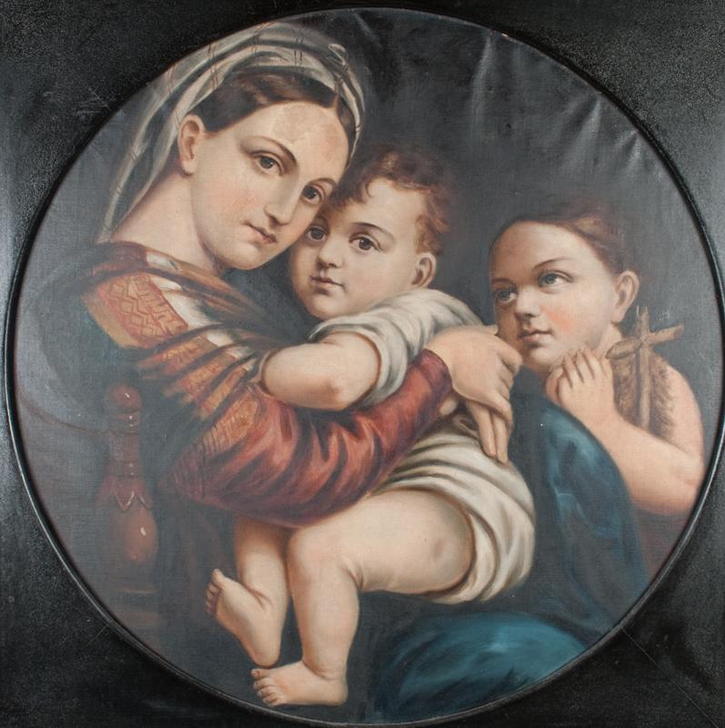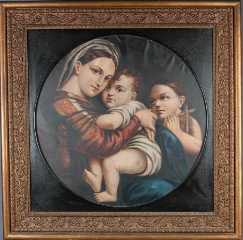 Painted to depict and mother and two children one child pulling a wooden cross they appear to be sitting on a bed as one spindle is exposed, painted on canvas laid on board in a circular format, unsigned, mounted in a wonderful carved wood and gesso frame, 25"D sight, 35"H X 35"W frame, small puncture whole .25" D not in figures, circa 1900 and possibly much earlier very well done.