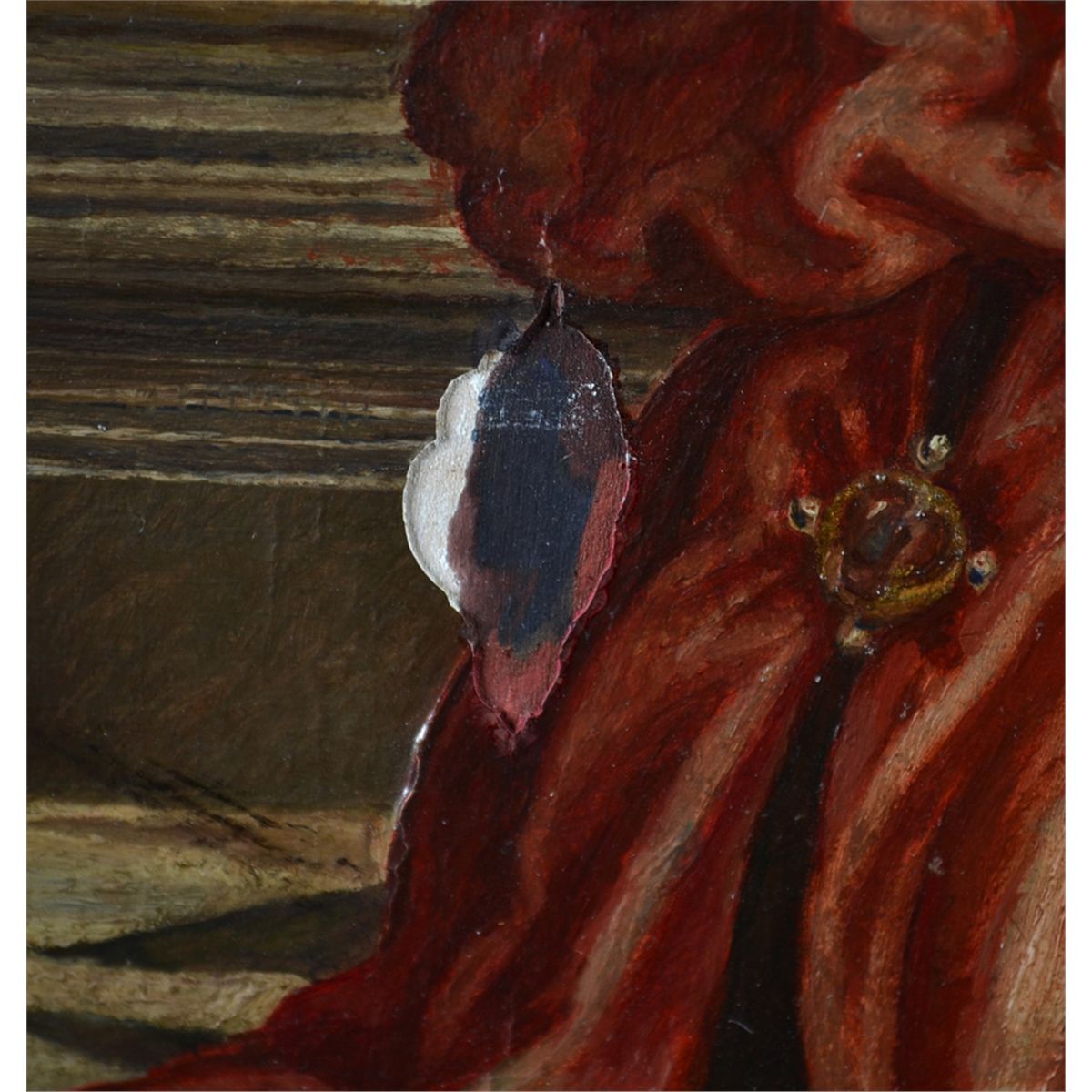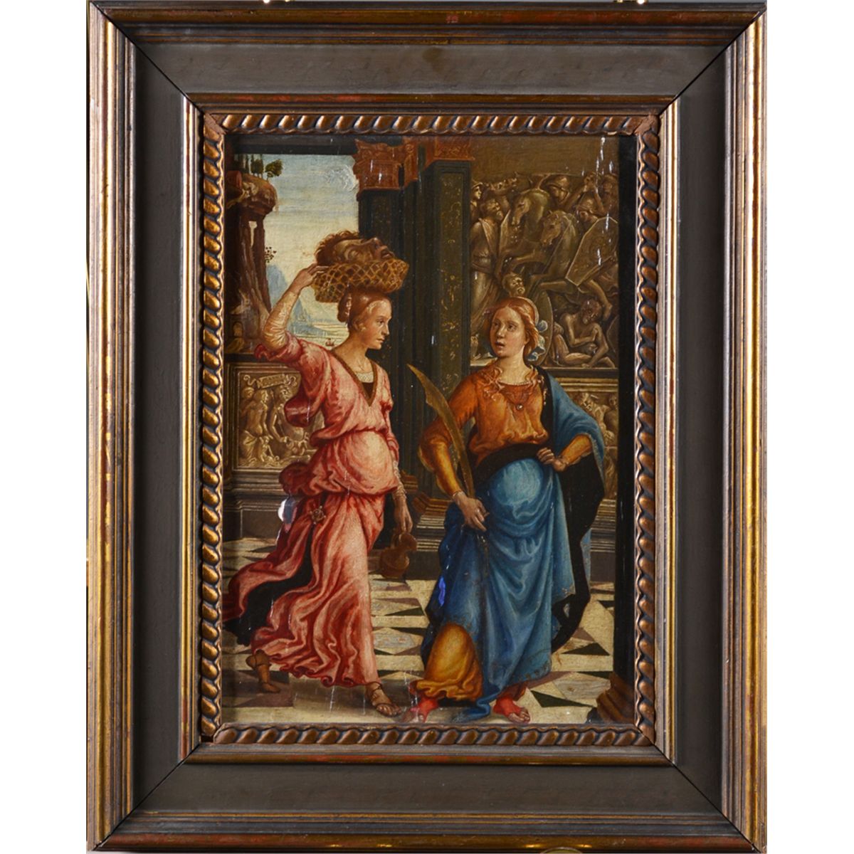 Finely painted to depict two female figures, with one holding her hat with a head and the other holding a sword (presumably the weapon that killed the man), amid a Greek interior scene. Unsigned, with two noticeable repairs; one in each of the dresses. Framed in a painted wood frame, 15.75" H x 11" W, sight, 22.75" H x 18" W, framed. Title and artist as well as information on tag en verso, although illegible. Circa 19th century. Private collection Oxford, MI.