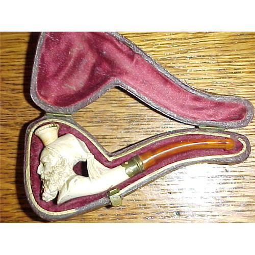 This is a great old pipe made out of carved meerschuam with an amber stem The stem is in perfect shape.In its original case It measures 3 1/4 inch long. So cute..