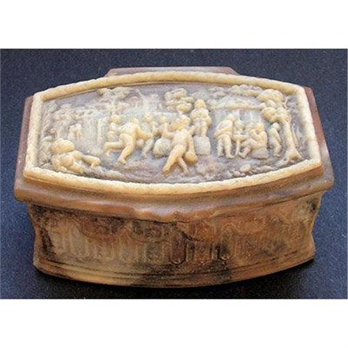 Chocolate color jewelry box with cream bas-relief scene of a villiage with lots of busy people, alone or in groups decorate the lid. The sides of this Incolay Stone jewelry box are adorned with banners and scrolls. The inside of box is lined with black velvet and there are velvet feet at each of the four bottom corners. This vintage Incolay jewelry box is piano hinged, measures approximately 5 inches x 3 1/4 inches x 2 1/2 inches tall. The box is in excellent condition and contains the original Incolay sticker.