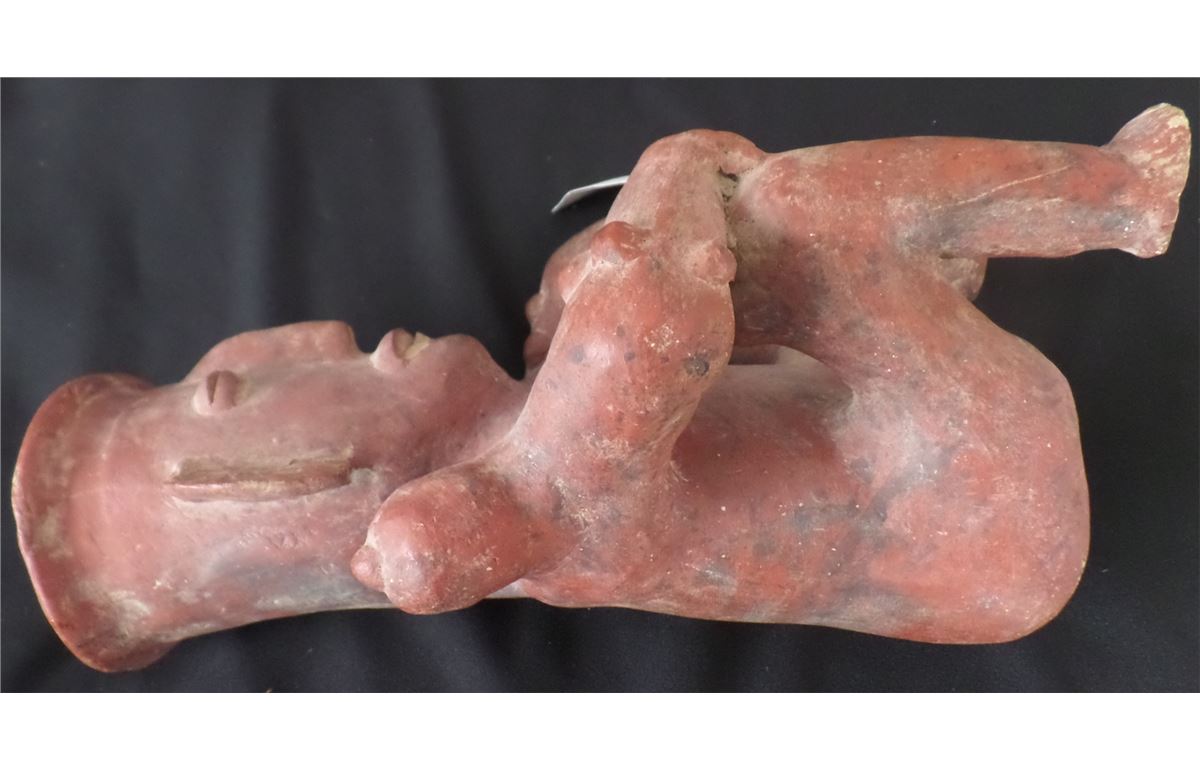 1900's (guessing) old Mexican Medical Figure from Colima, Mexico. This item is made of clay and measures 11 1/2 x 7 x 4 inches. It has chips on lower lip and chips on feet. The figure appears to illustrate tumors on arm and shoulders. Something is apparently missing on right knee. Shipping $30.00