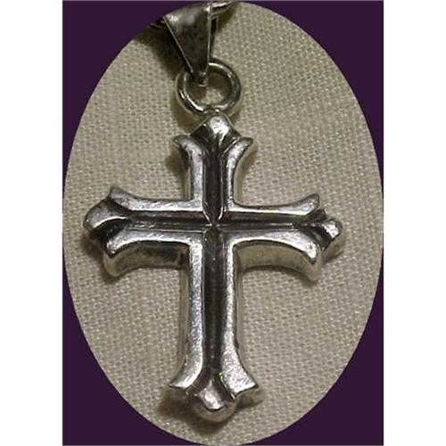 Old Mexican Sterling Cross. It is a susbantial piece of sterling. The total weight with the hefty chain is 20 grams. Most likely it is the work of Taxco Silversmith but the number/letter marking have worn off the bail. The cross is simply marked 925. <p> The length of the entire necklace from clasp to bottom tip of cross hangs down to 9 1/8". <p>The condition is excellent although there are some minor surface scratches and old patina.
