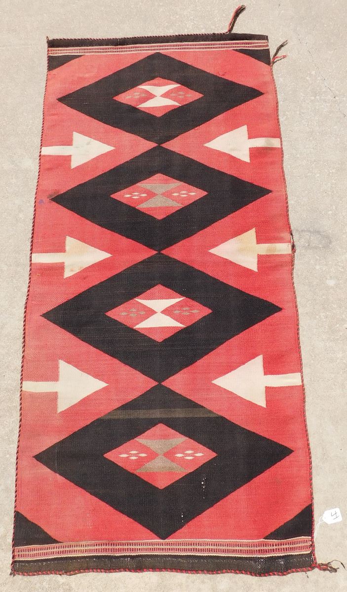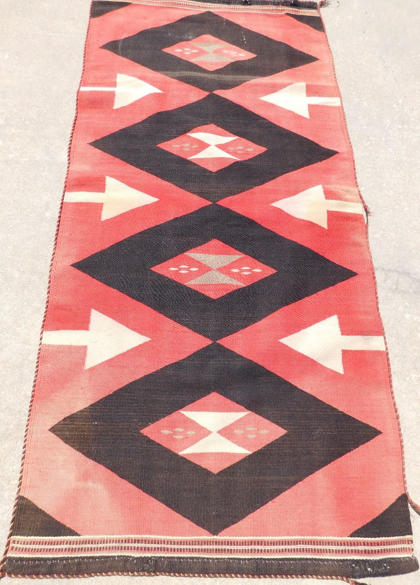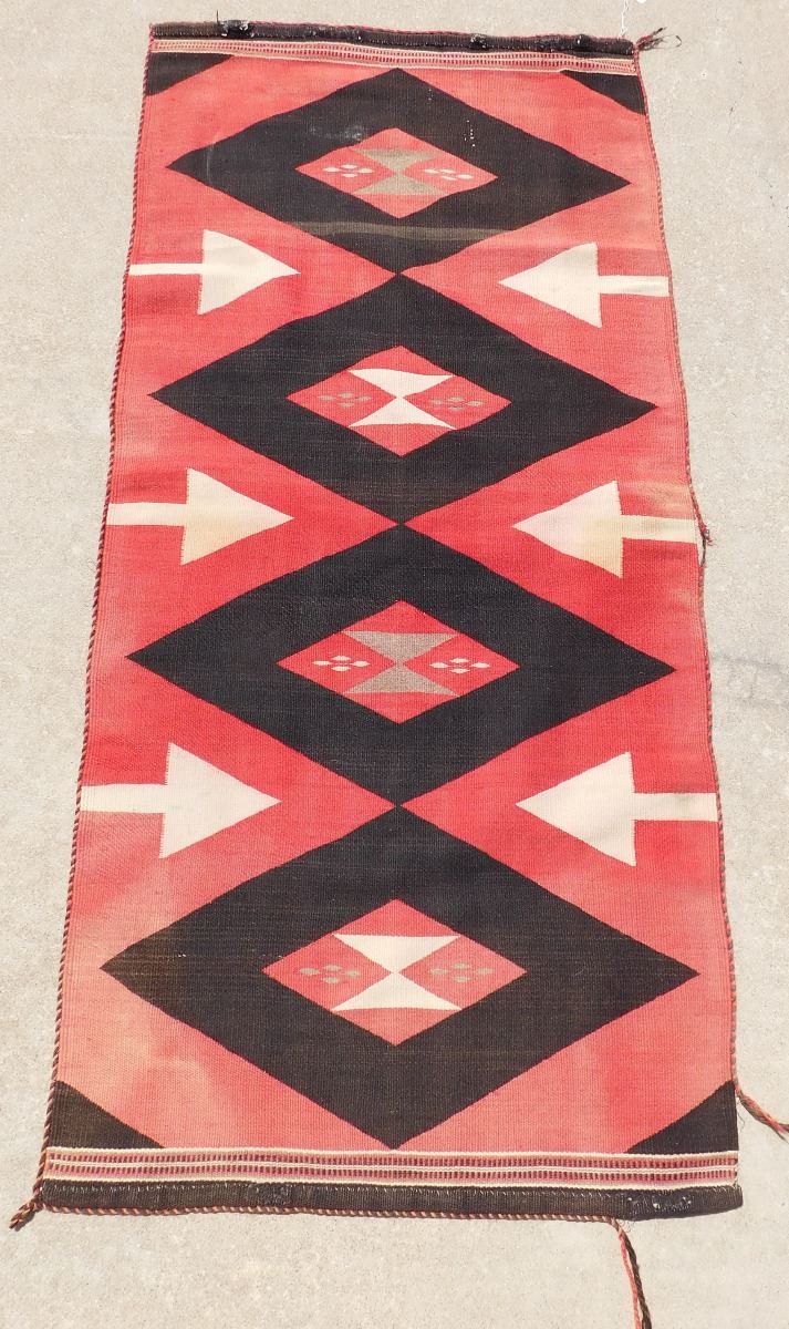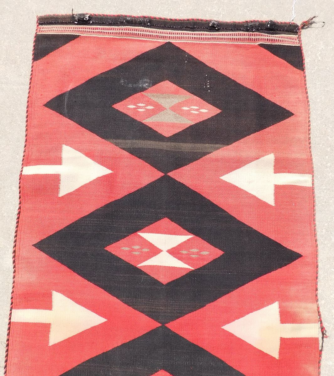 Old Mexican Weaving, circa 1930's. Made of wool and cotton, this weaving with arrows measures 28 x 58 inches. It is from Central Mexico. Condition: Some stains and color fading, see images. Shipping: $30.00.