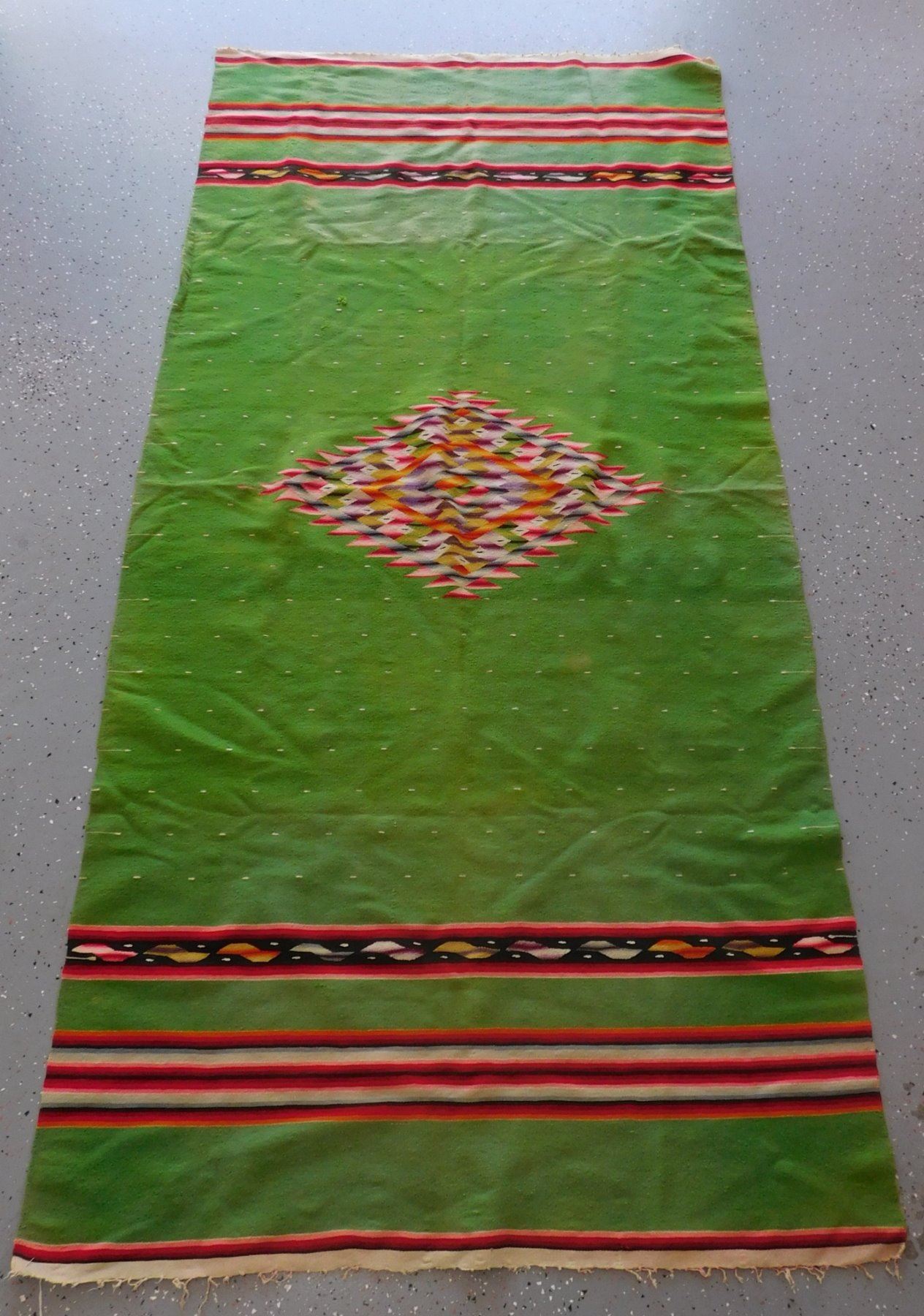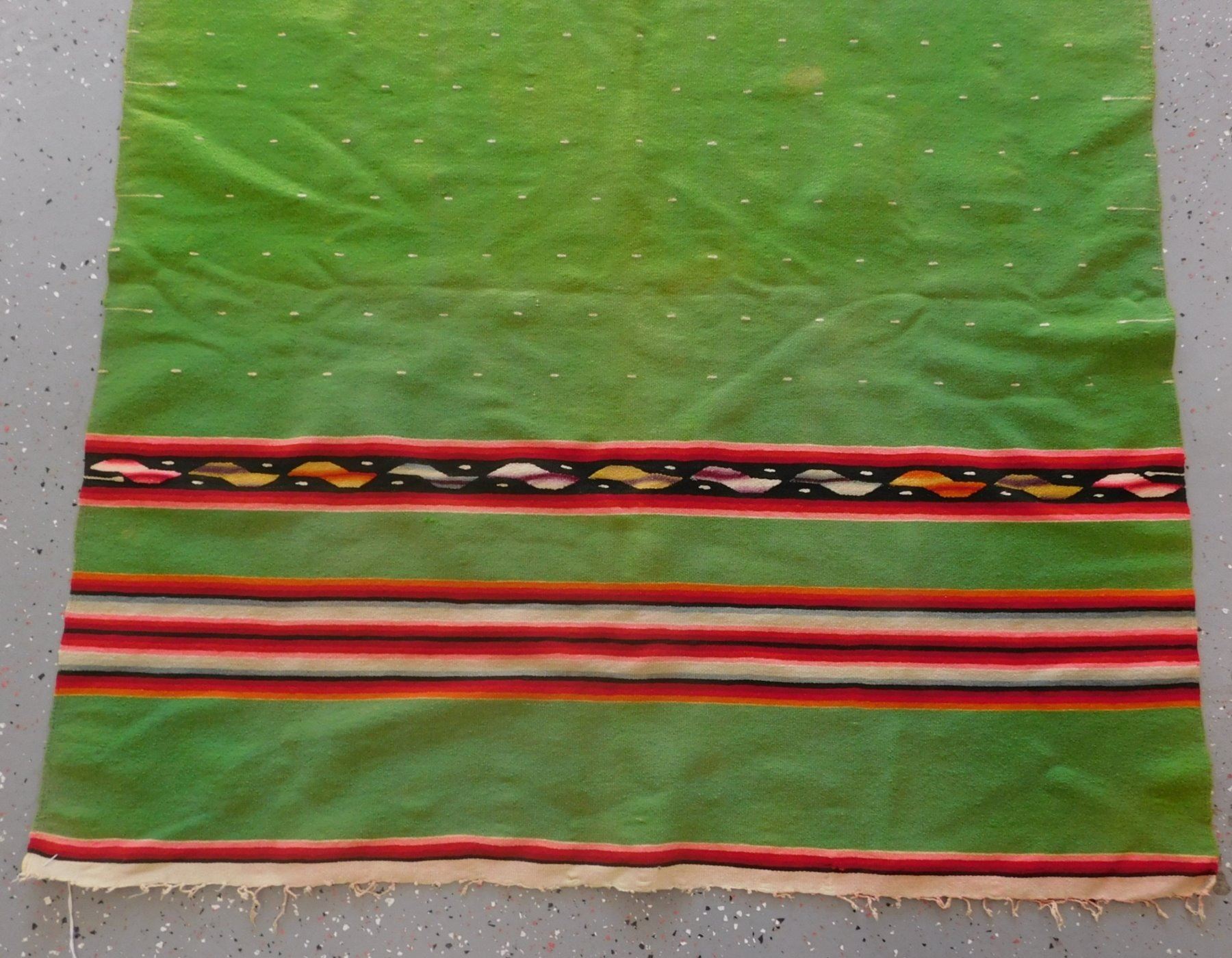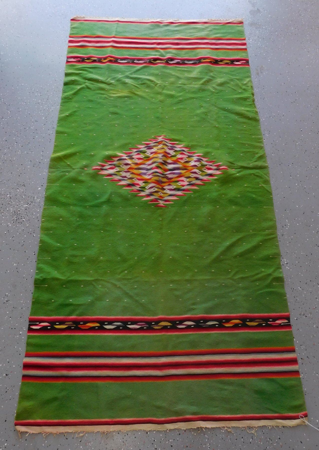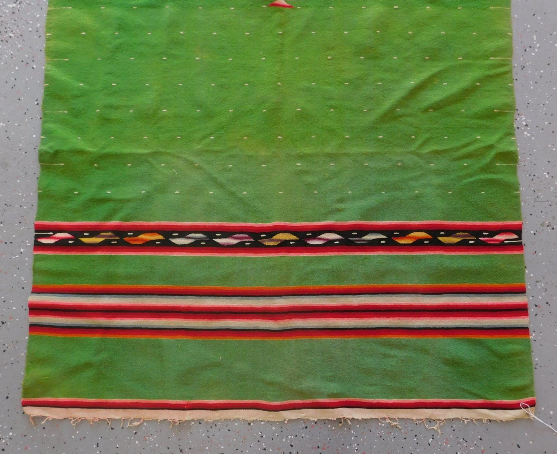 Old Mexican Weaving, c. 1940s. Made of wool, the item measures 38" x 84". Mexico. Condition: Small hole, some sun fading, see images. Shipping: $26.00 w/insurance and signature.