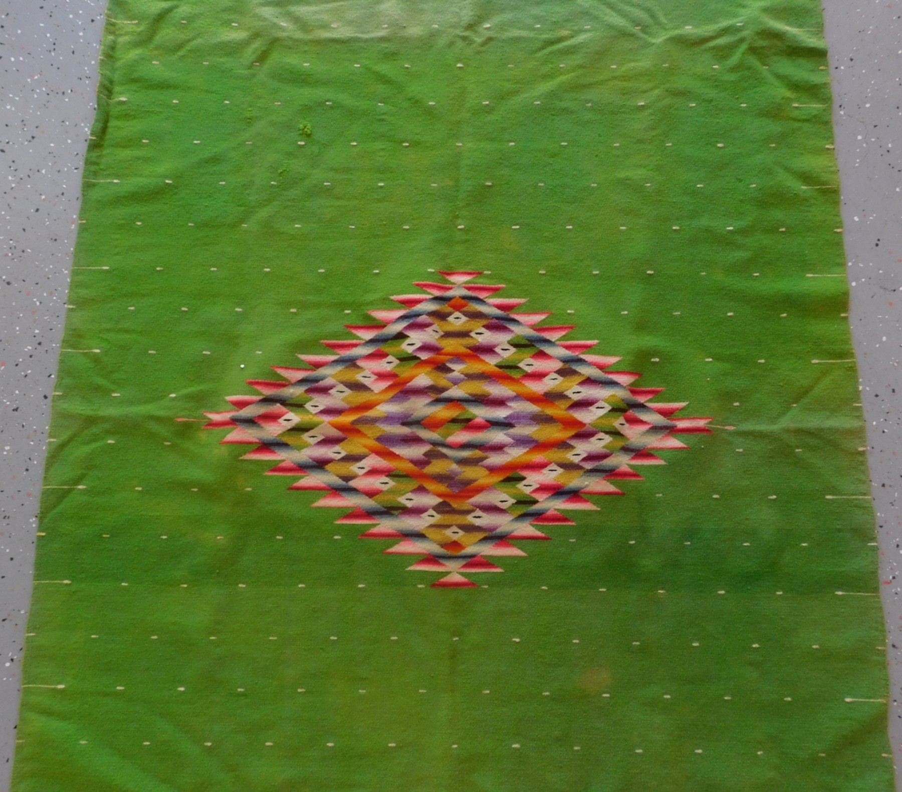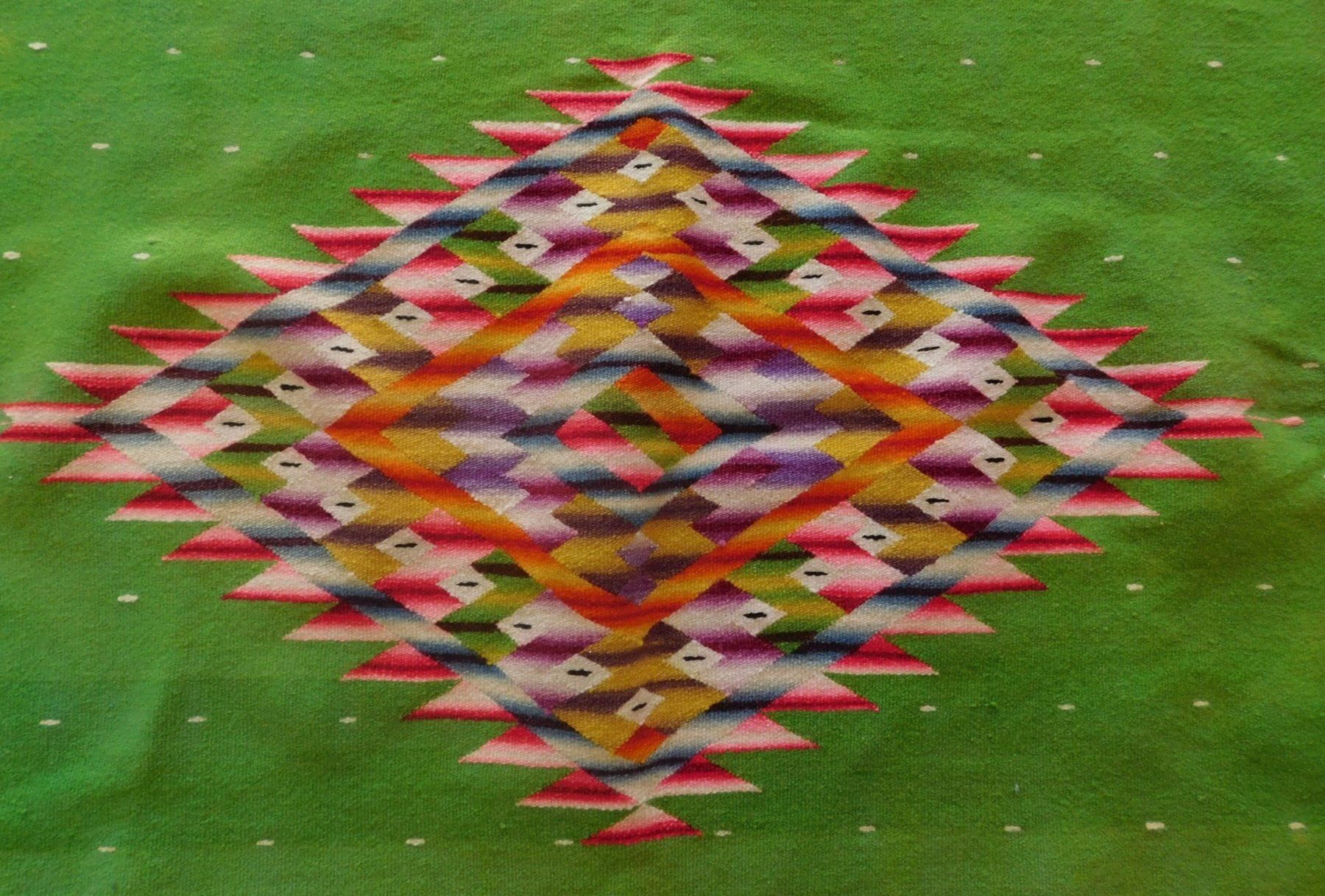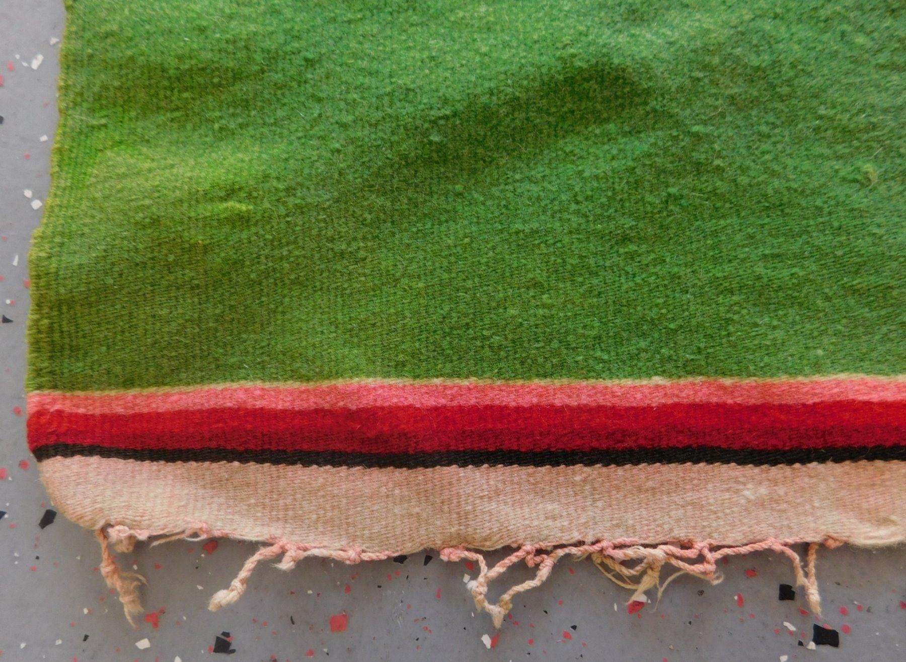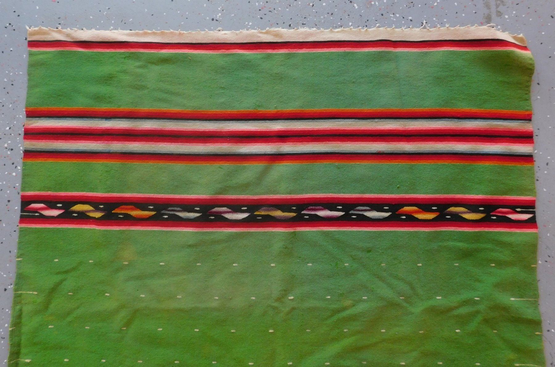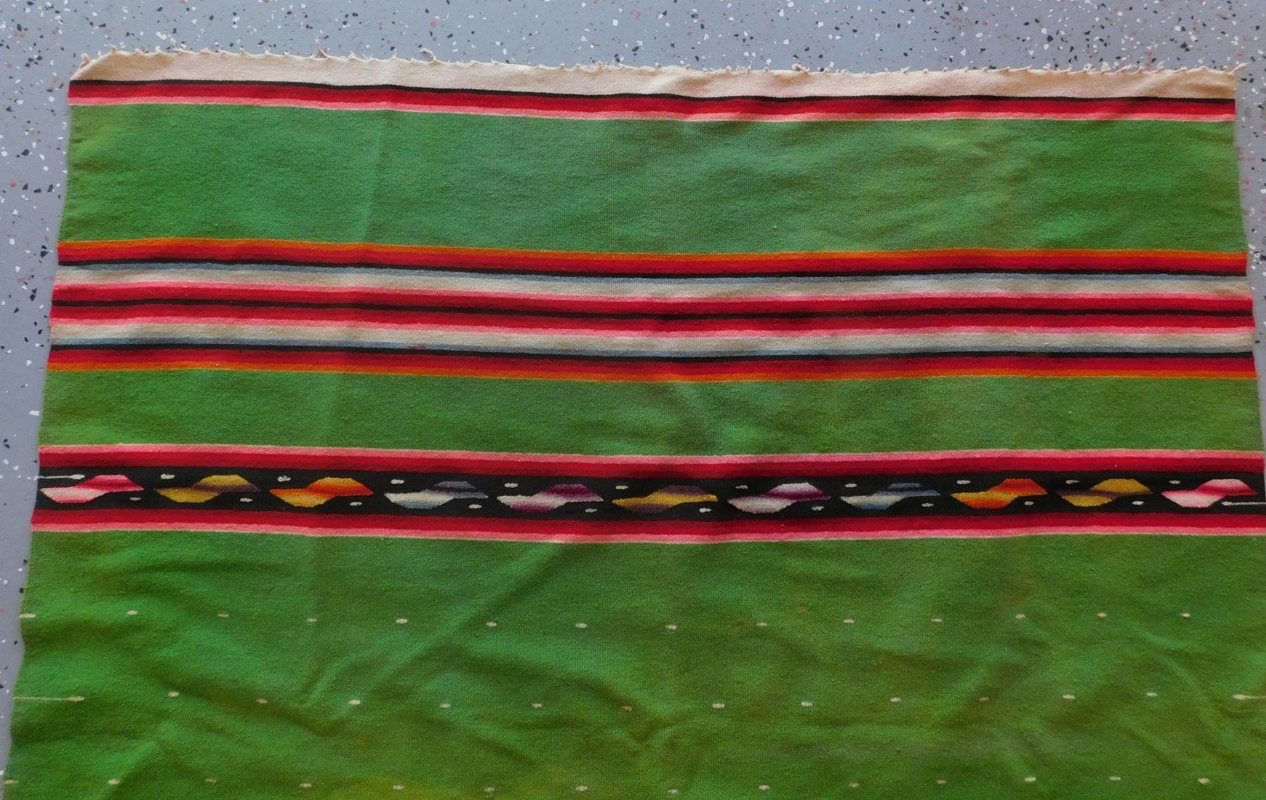 Old Mexican Weaving, c. 1940s. Made of wool, the item measures 38" x 84". Mexico. Condition: Small hole, some sun fading, see images. Shipping: $26.00 w/insurance and signature.
