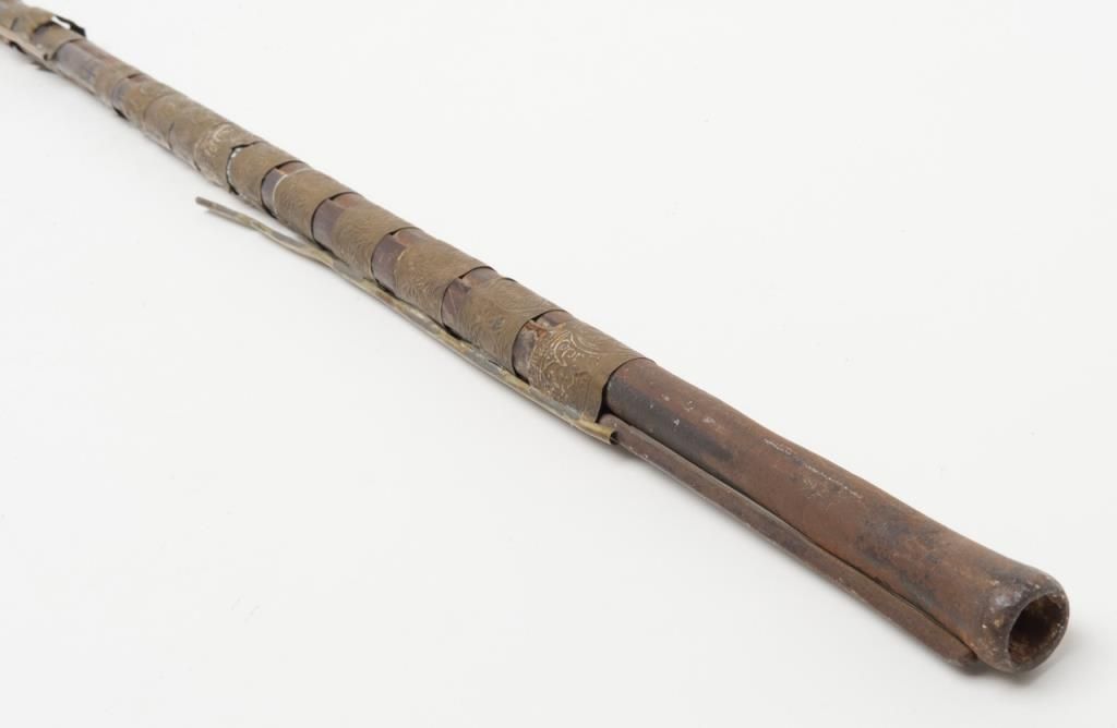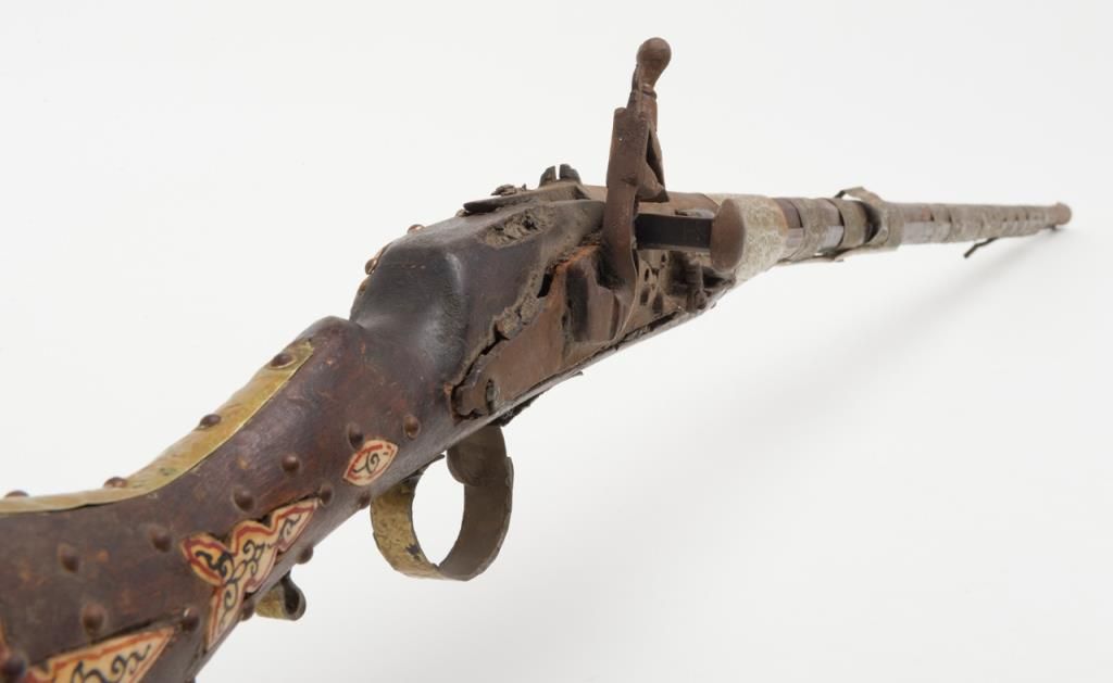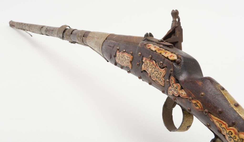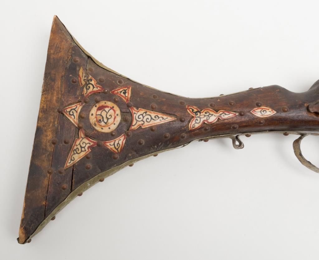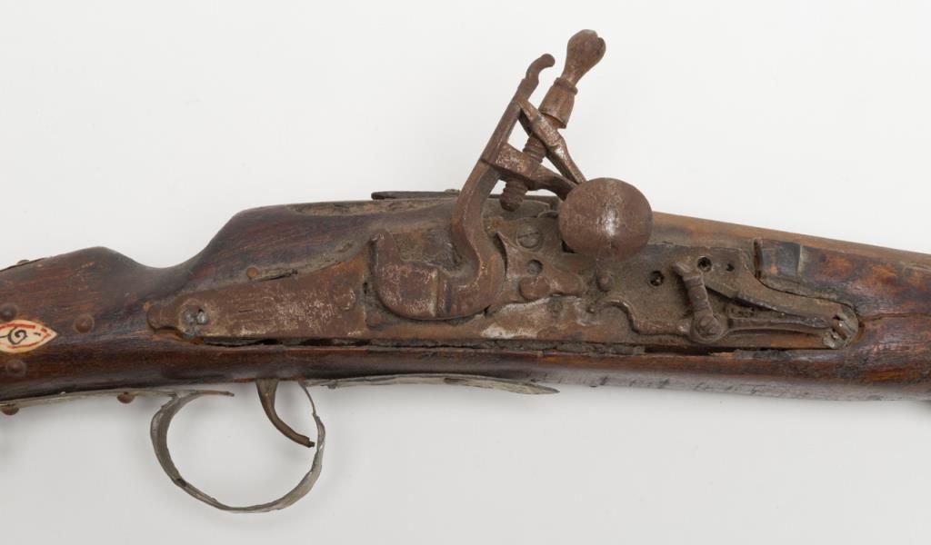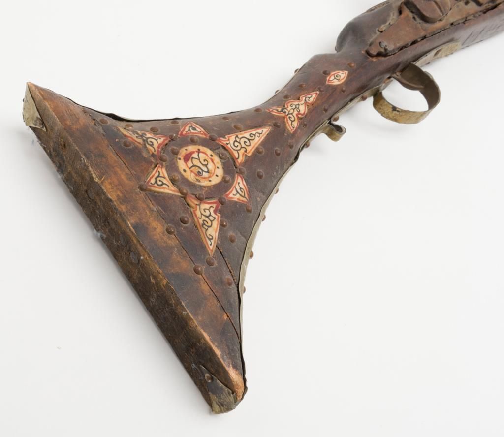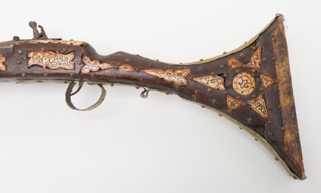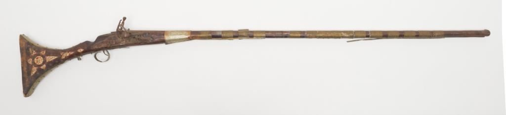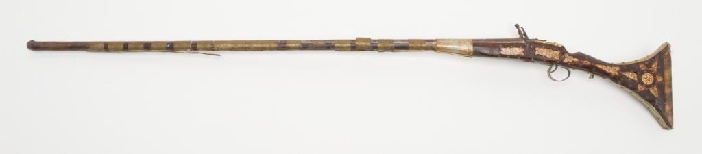 Old Mid-Eastern Miquelet “Camel” gun, approx. 65” overall with a 50-1/2” barrel, in well-worn condition showing long storage with hammered tin barrel bands, some loose, wood stock shows old losses and cracks, lots of metal bead decorationsand inlaid painted bone decorations in the butt stock; would benefit from some careful restoration and cleaning. Est.: $400-$800.