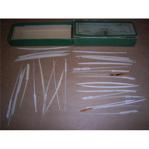 Old pick-up stick game, or mikado. The box is falling apart, but there is written on it: Federspiel and Spellicans and Jeu de Junchetes. The box is 12.5 centimeter [4.9 inches] by 5 centimeter [1.96 inches]. I think it is from around 1900-1920, and if you collect old games it is a nice collectors item. Weight including the box is 30 gram [1 ounce].